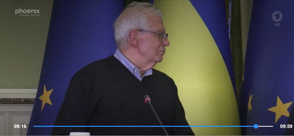 In dieser Funktion ist der sogenannte EU-Außenbeauftragte Josep Borrell. Er spricht für uns Bürgerinnen und Bürger in der EU, ob wir das wollen oder nicht. Am 09.04.2022 wurde hier wie anderswo berichtet, der Krieg in der Ukraine würde in der Schlacht um den Donbass entschieden. Er forderte die EU-Mitgliedsstaaten dazu auf, Waffen an die