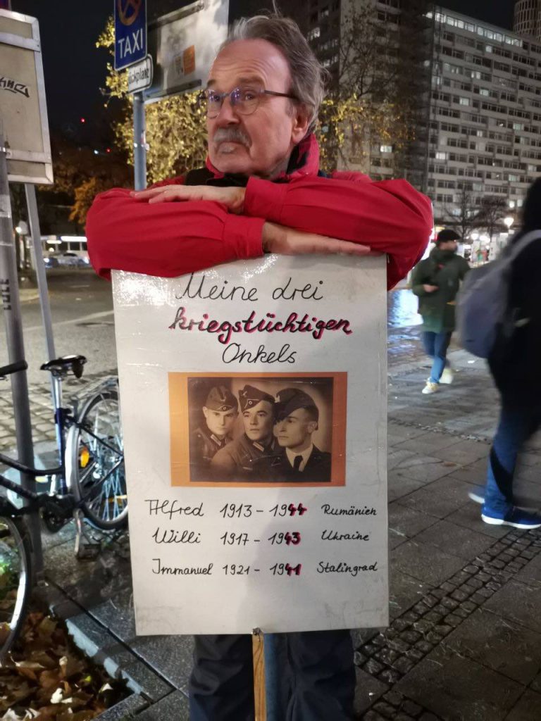 „Ich hätte ehrlich nie gedacht, dass ausgerechnet in unserem Land die Hardliner und Scharfmacher so viel Gehör finden. Vielleicht liegt ein Grund darin, dass vielen von denen aufgrund ihres Alters oder besser gesagt aufgrund ihrer Jugend die eigene Erfahrung fehlt, was Krieg bedeutet. Das ist keine ‚aseptische‘ Joystick-Operation, die punktgenau militärische Ziele ohne Menschen trifft. Krieg – ganz gleich welcher – ist Barbarei. Krieg ist das Kriegsverbrechen. Ich würde mir wünschen, dass junge Menschen, die mit ihrem Engagement im Kampf gegen den Klimawandel Gesellschaften weltweit aufgerüttelt haben, dass die das Thema ‚Frieden’ entdecken und sich dafür mit der gleichen Kraft einsetzen.“