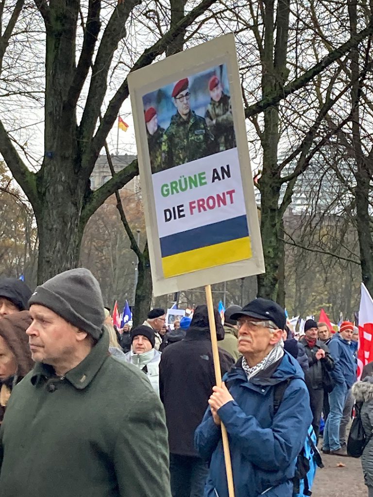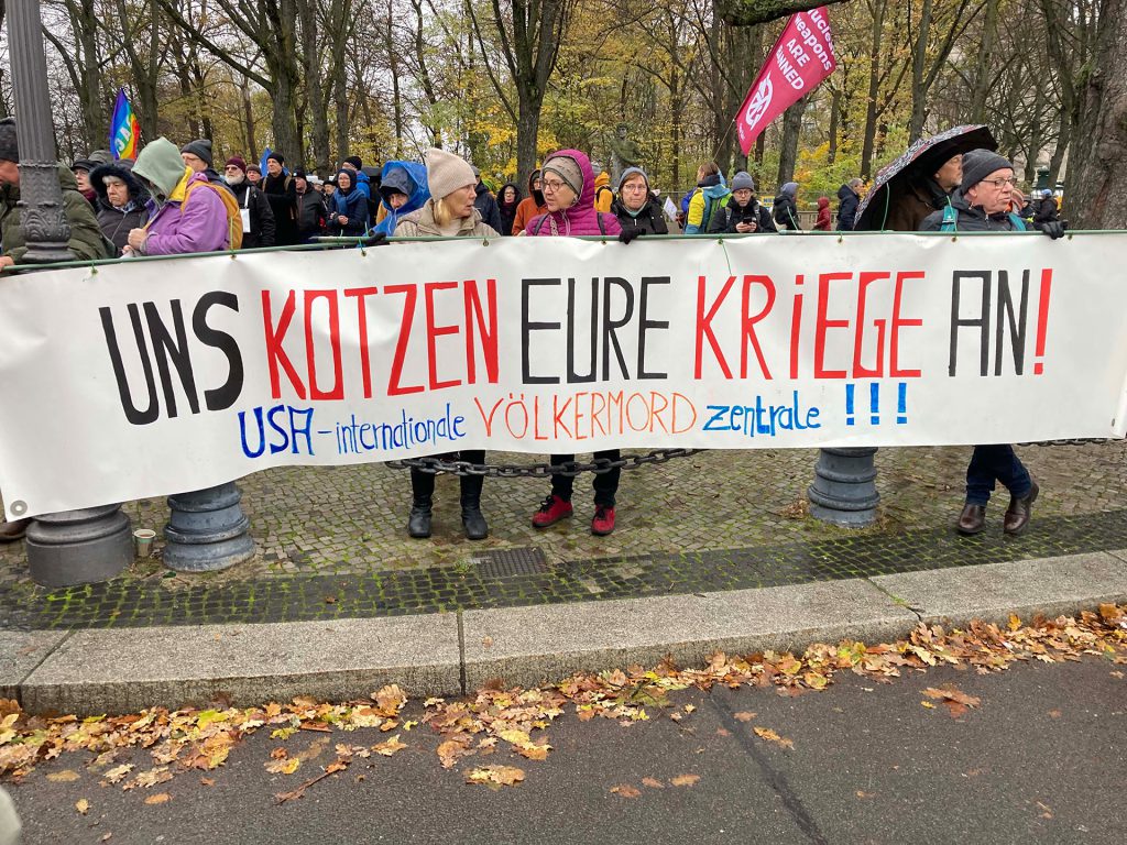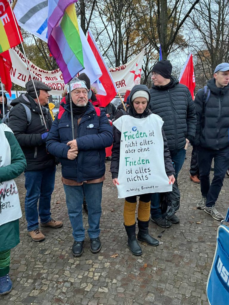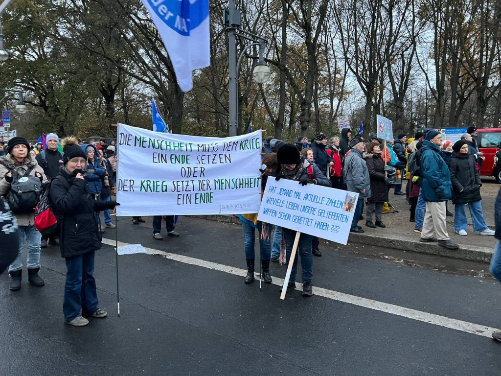 Es überraschte mich, dass es am Samstag im Vergleich zum Februar dieses Jahres unter den Teilnehmern keinerlei Berührungsängste zu geben schien: verschiedene Friedensbündnisse u.a. aus München ‚Macht-Frieden’, Kassel, Osnabrück, Bremen, türkisch-deutschen Gruppierungen, Palästinenser, verschiedene Gewerkschaften, Aktivisten von ‚Free Assange‘ uvm. demonstrieren Seit’ an Seit’. Und vor allem die vielen tausend Einzelaktivisten und -aktivistinnen, die unermüdlich wohl nicht das erste Mal gegen Krieg auf die Straße gingen. Beeindruckend die Energie und Ausdauer, die Fantasie bei der Gestaltung der Schilder:
