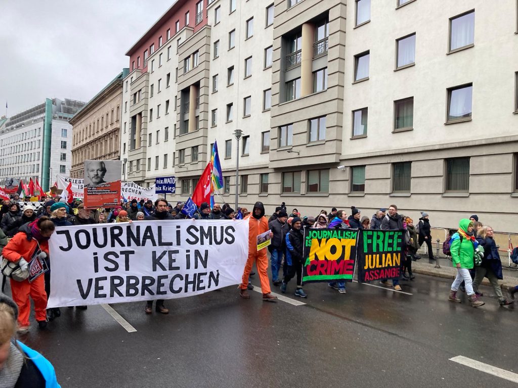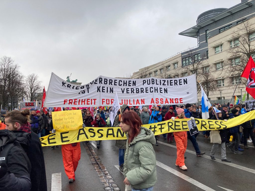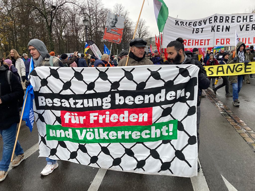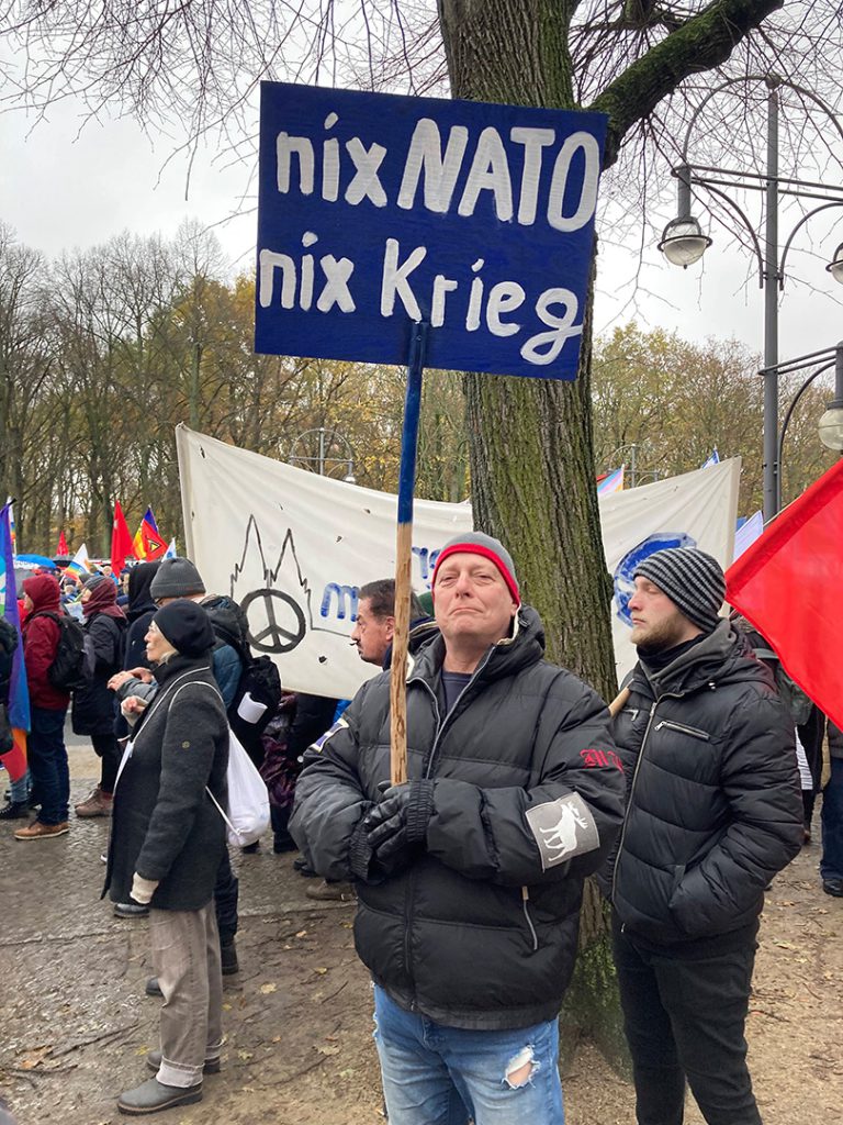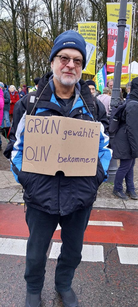 Es überraschte mich, dass es am Samstag im Vergleich zum Februar dieses Jahres unter den Teilnehmern keinerlei Berührungsängste zu geben schien: verschiedene Friedensbündnisse u.a. aus München ‚Macht-Frieden’, Kassel, Osnabrück, Bremen, türkisch-deutschen Gruppierungen, Palästinenser, verschiedene Gewerkschaften, Aktivisten von ‚Free Assange‘ uvm. demonstrieren Seit’ an Seit’. Und vor allem die vielen tausend Einzelaktivisten und -aktivistinnen, die unermüdlich wohl nicht das erste Mal gegen Krieg auf die Straße gingen. Beeindruckend die Energie und Ausdauer, die Fantasie bei der Gestaltung der Schilder:
