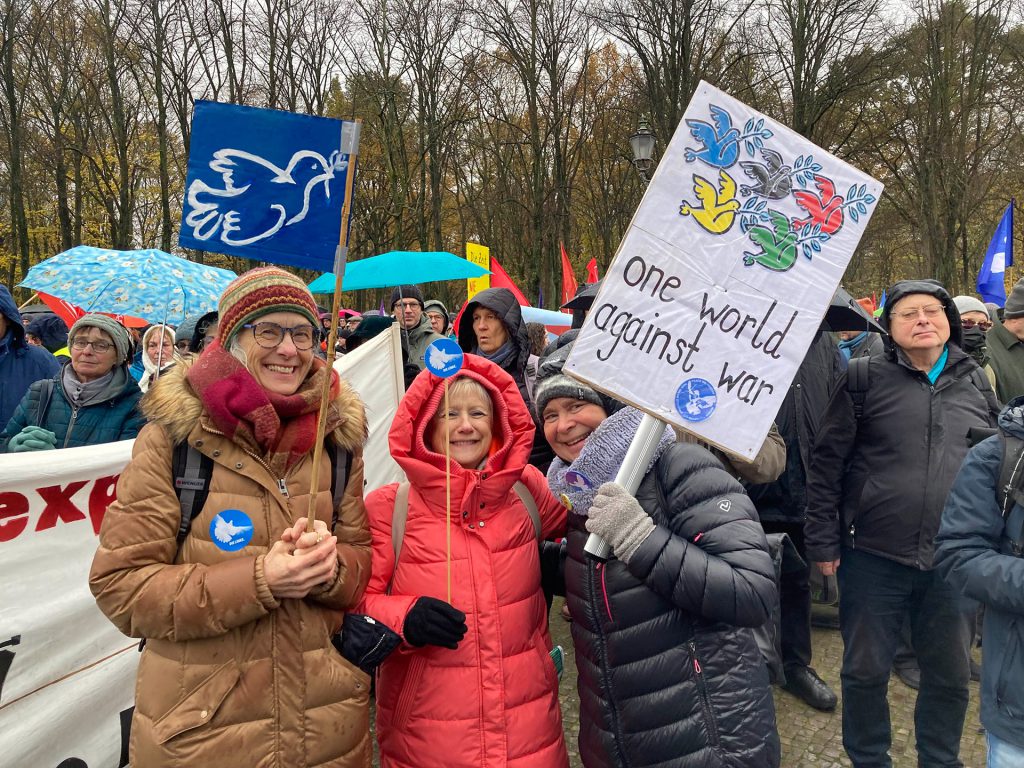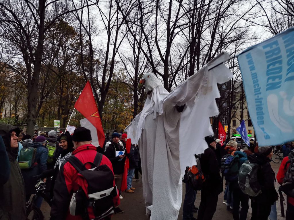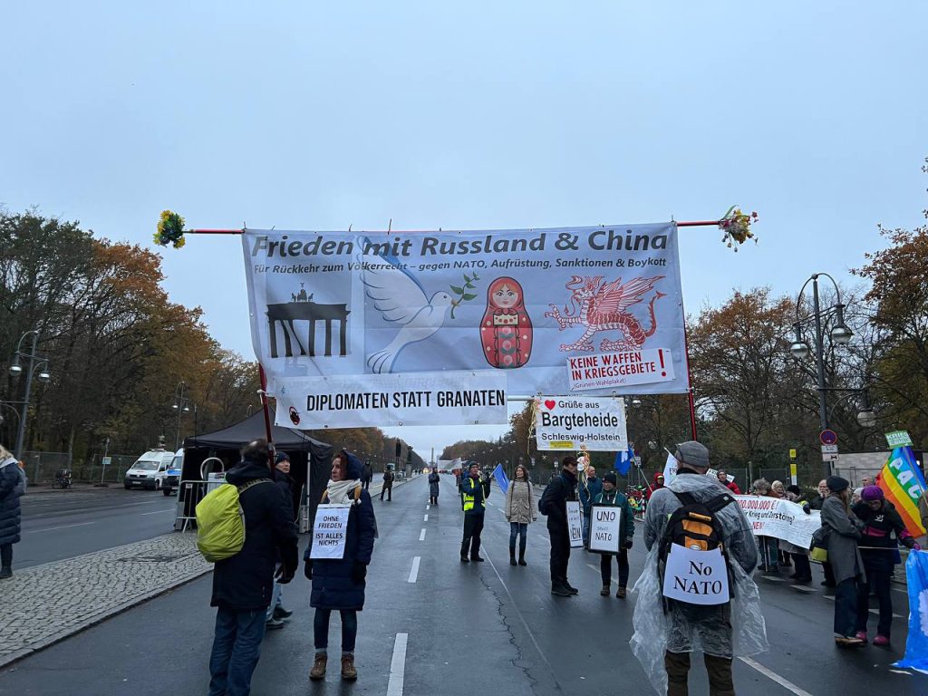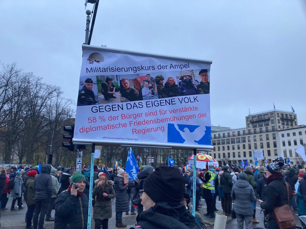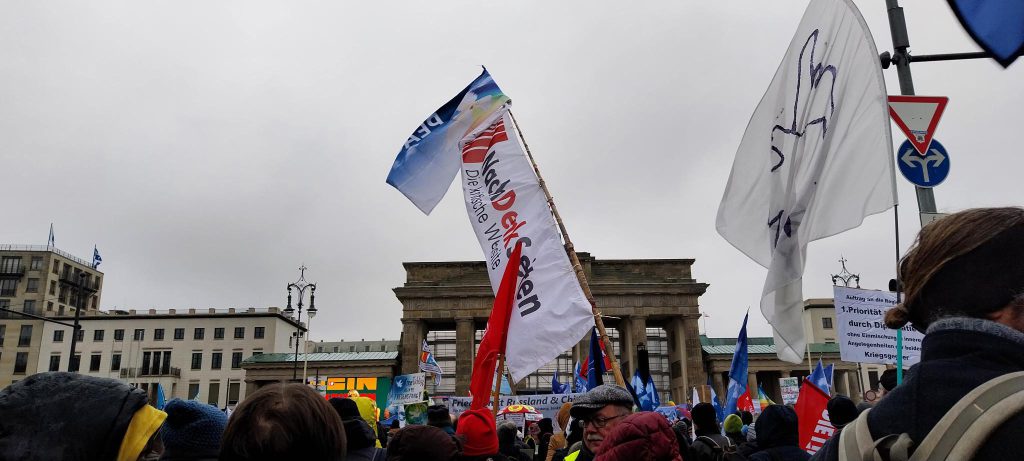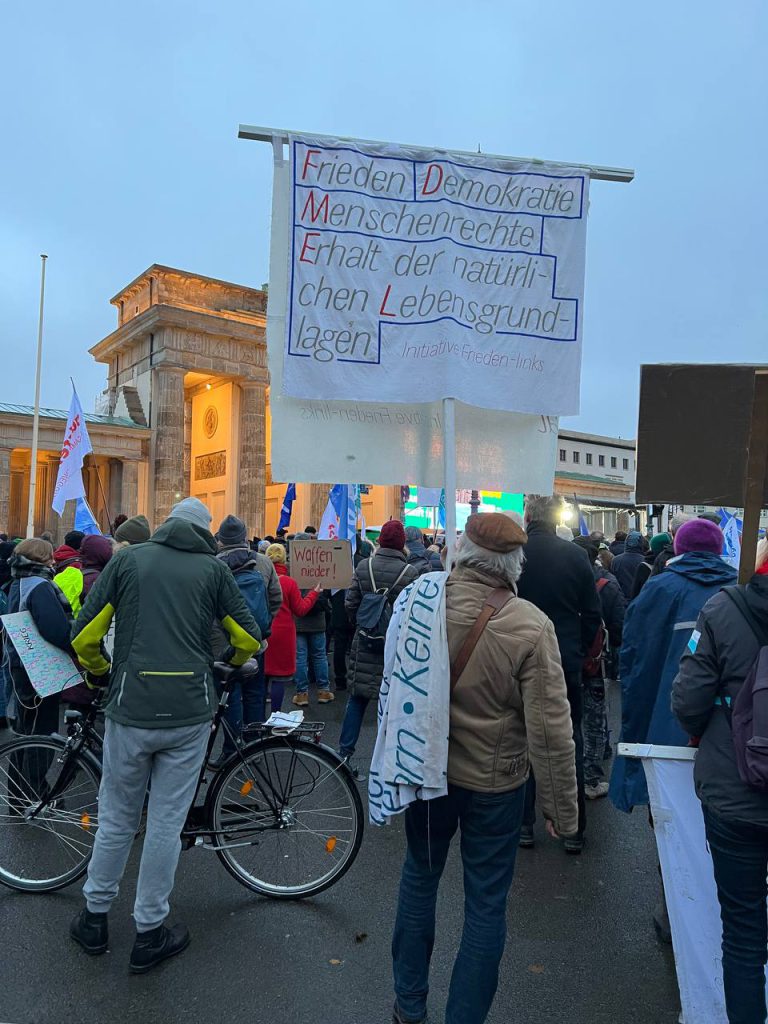 Trotz unwirtlichem, naßkaltem Wetter fanden sich am letzten Samstag laut Veranstalter ca. 20.000 Friedensaktivisten vor dem Brandenburger Tor ein, um gegen Militarisierung und Krieg, für Frieden, Diplomatie und Abrüstung zu demonstrieren. Die Polizei sprach am Nachmittag von 10.000 Teilnehmern.