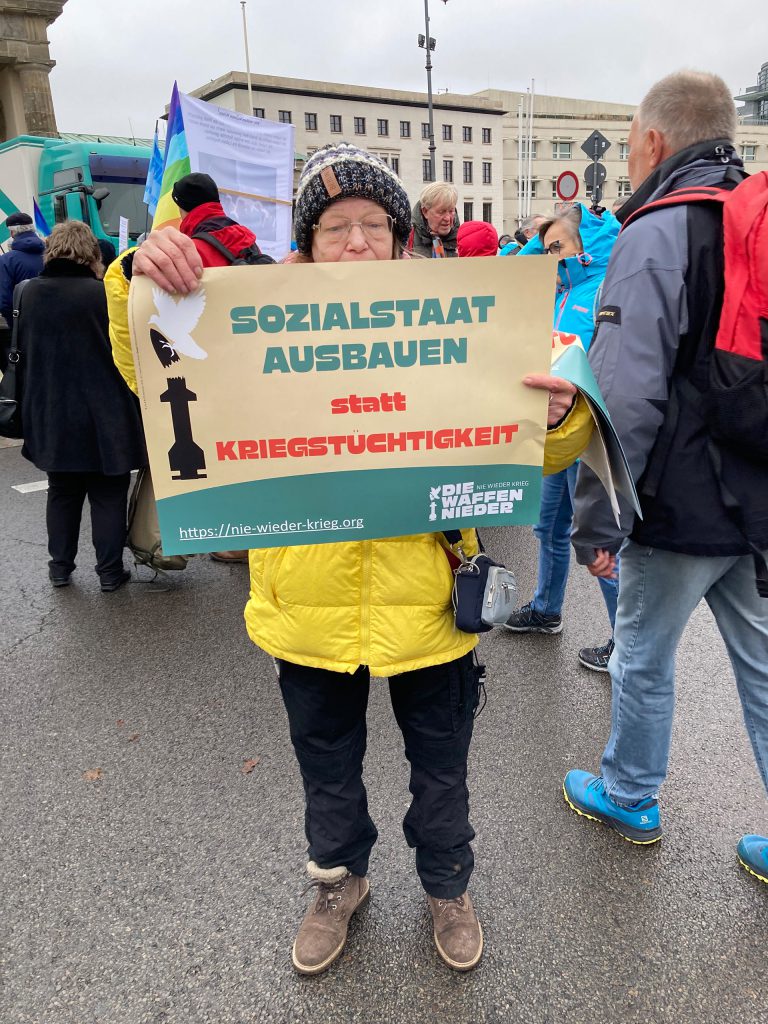 Im Vergleich zur Veranstaltung von Aufstand-für-Frieden am 25. Februar dieses Jahres waren es deutlich weniger Teilnehmer und Teilnehmerinnen, damals sprachen die Veranstalter von 50.000. Ich frage mich, warum das so ist. Je dringlicher es wird, sich gegen eine vollkommen enthemmte Kriegspolitik der Regierung aufzulehnen, desto mehr scheinen sich viele Menschen immer mehr zurückzuziehen. Ist ihnen nicht bewusst, dass ihre eigene Lebensgrundlage, ihre eigene Zukunft auf dem Spiel steht? Die überwiegende Mehrheit vor dem Brandenburger Tor waren Menschen älteren Semesters, m.E. zu wenige jüngere. Gabriele Krone-Schmalz vermutet: