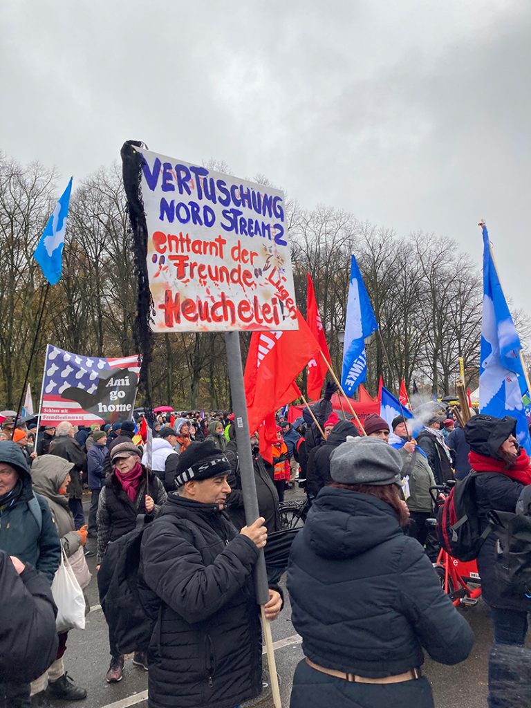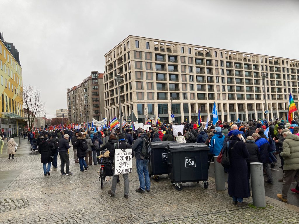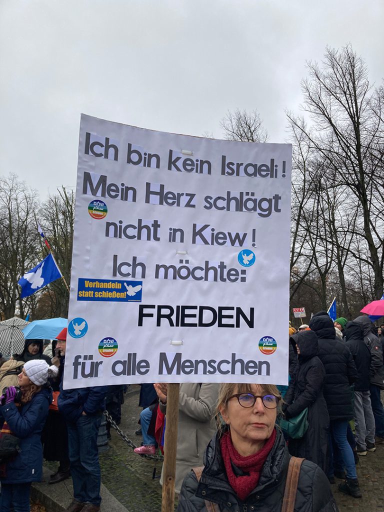 Die Abschlusskundgebung wurde von Michael Müller eingeleitet, der auf Deutschlands historische Verantwortung nach zwei Weltkriegen im letzten Jahrhundert verwies und an die Fähigkeit der Deutschen erinnerte, Lösungen friedlich zu gestalten, wie die Ostdeutschen dies im Jahr 1989 taten. Ates Gürpınar hielt im Großen und Ganzen eine durchaus vernünftige Rede, er hält jedoch offenbar Sanktionspolitik gegen ‚russische Oligarchen‘ für ein legitimes Mittel, um Druck auszuüben. Dass diese Politik in erster Linie der eigenen Volkswirtschaft schadet, hat er wohl noch nicht begriffen, seine Rede glich daher eher einer Kampfrede im Bundestag als einem parteiübergreifenden Friedensappell. Abschließend traten Iris Hefets und Nadja Samour ans Rednerpult. Sie gaben ein Beispiel dafür, was heute dringender denn je gebraucht wird: Spaltung überwinden, um dem Krieg ein Ende zu setzen.