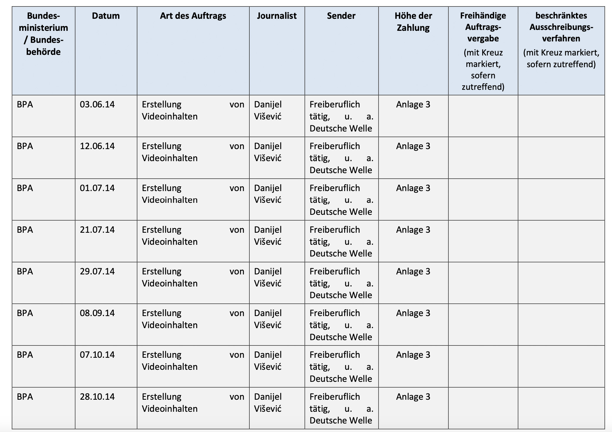 Eine ähnliche Frage stellt sich im Falle der jahrelangen und beinahe monatlichen Zahlungen des Bundespresseamtes (BPA) an einen Journalisten für die Erstellung von Videomaterial, der sonst vor allem für den deutschen Auslandssender Deutsche Welle (DW) tätig war. In diesem Fall wird zwar der Name genannt, die Höhe der Zahlung aber als VS – Vertraulich eingestuft. Grundsätzlich stellt sich im Falle dieser über Jahre und fast im Monatsrhythmus erfolgten Zahlungen zudem die Frage, wie unabhängig ein solcher Journalist vor solch einem Hintergrund noch über den Kanzler und das ihm direkt unterstellte BPA berichten kann: