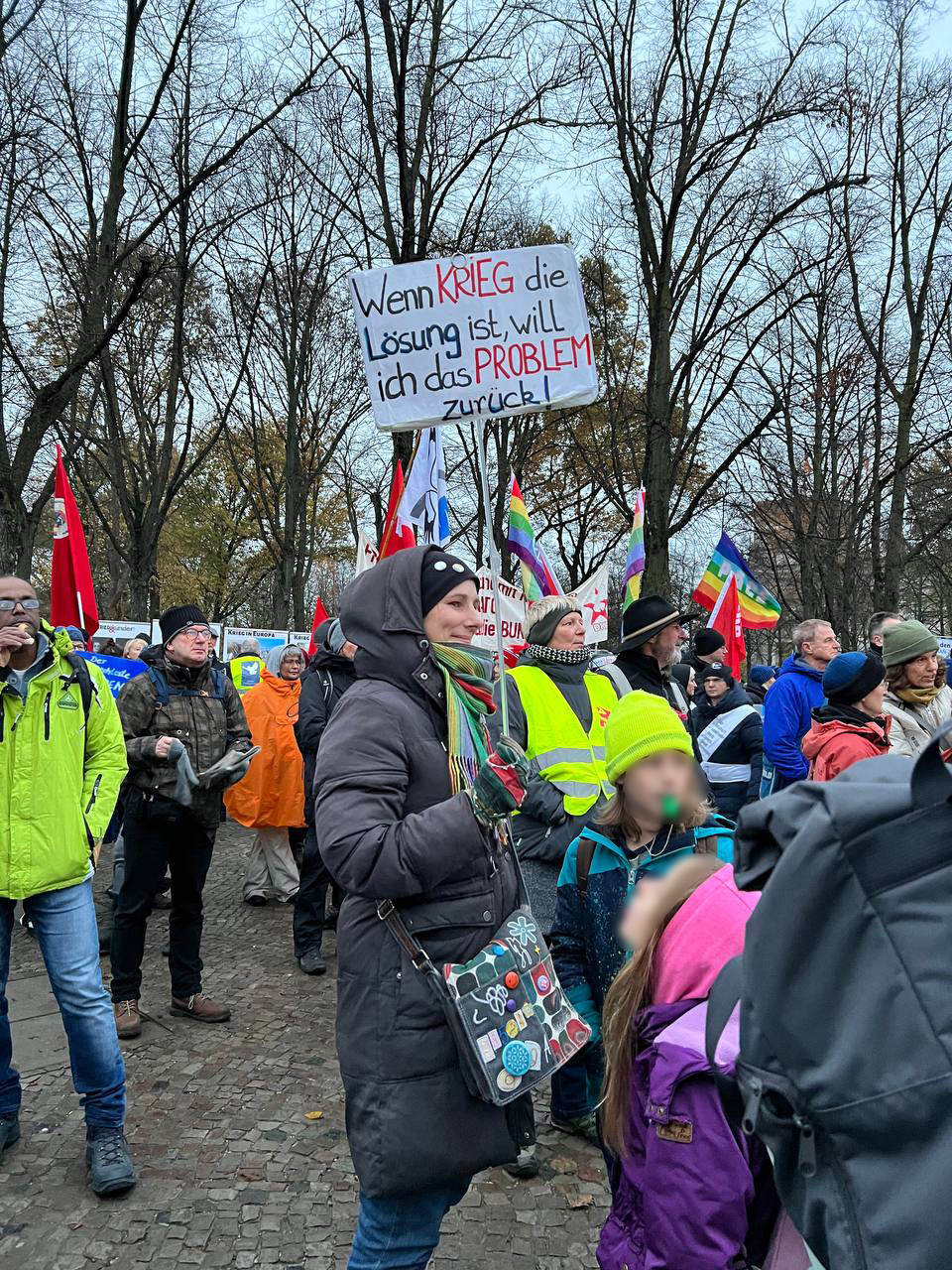 Es überraschte mich, dass es am Samstag im Vergleich zum Februar dieses Jahres unter den Teilnehmern keinerlei Berührungsängste zu geben schien: verschiedene Friedensbündnisse u.a. aus München ‚Macht-Frieden’, Kassel, Osnabrück, Bremen, türkisch-deutschen Gruppierungen, Palästinenser, verschiedene Gewerkschaften, Aktivisten von ‚Free Assange‘ uvm. demonstrieren Seit’ an Seit’. Und vor allem die vielen tausend Einzelaktivisten und -aktivistinnen, die unermüdlich wohl nicht das erste Mal gegen Krieg auf die Straße gingen. Beeindruckend die Energie und Ausdauer, die Fantasie bei der Gestaltung der Schilder: