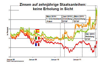Immer wieder wurde betont, dass man in Europa nicht für einander einstehen werde – kein glaubwürdiges Bekenntnis zur Krisenlösung! Entsprechend sorgte auch keine der beschlossenen Maßnahmen für eine Beruhigung der Anleger: Die Zinsen für Staatsanleihen stiegen immer weiter. Zuletzt griff die Unsicherheit auf Frankreich über, wie die Grafik zeigt.