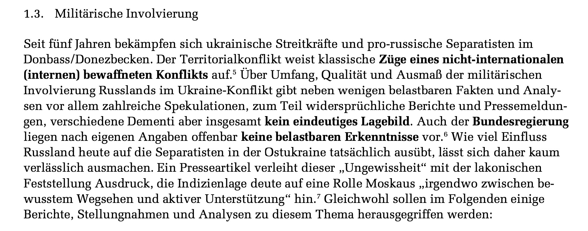Aber auch die Nennung der Ukraine als Beispiel für einen „heißen (Angriffs-)Krieg“ Russlands ab 2014 ist in dieser absoluten Wortwahl kaum haltbar. In einem Gutachten der Wissenschaftlichen Dienste des Bundstages von 2019 unter dem Titel „Intervention in Bürgerkriegsgebieten: Zur Rolle Russlands im Ost-Ukraine-Konflikt“ heißt es unter anderem, dass der Konflikt als „interner Territorialkonflikt“ bewertet wird, dass es „über Umfang, Qualität und Ausmaß der militärischen Involvierung Russlands im Ukraine-Konflikt“ wenig belastbare Fakten gäbe und dass auch der Bundesregierung nach eigenen Angaben „offenbar keine belastbaren Erkenntnisse“ vorlägen: