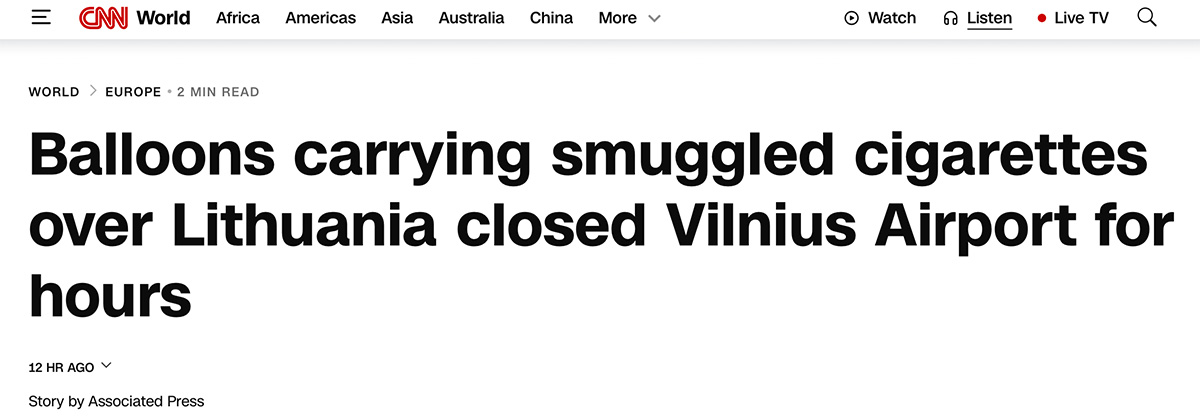 In dem Kontext wird von BBC zudem erwähnt, dass Zigarettenschmuggler aus Belarus verstärkt auf Heißluftballons statt Drohnen setzen, da Erstere viel billiger seien, um Zigaretten in die EU zu schmuggeln. Laut CNN wurden allein letztes Jahr 966 Heißluftballons sowie eine nicht näher genannte Zahl an Drohnen von den litauischen Behörden abgefangen. Mit einem Unterschied: Letztes Jahr wurden diese von Schmugglern eingesetzten Drohnen und Heißluftballons noch nicht von Politik und Medien als „russische Provokation“ verkauft.