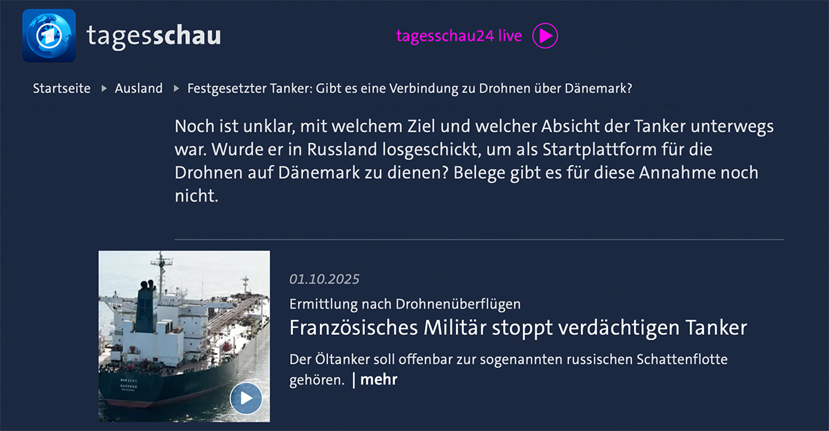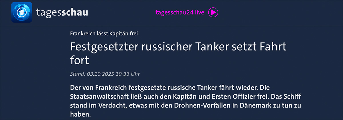 Ein ähnliches Bild ergibt sich auch in Frankreich. Dort wurde medienwirksam ein angeblich „russischer Tanker“ durch eine Eliteeinheit der französischen Kriegsmarine am 27. September in internationalen Gewässern vor der bretonischen Insel Île d’Ouessant aufgebracht und im französischen Hafen Saint-Nazaire festgesetzt. Der Vorwurf lautete, wie die Tagesschau am 2. Oktober berichtete, das Schiffe gehöre „allem Anschein nach zur russischen Schattenflotte“. Weiter heißt es suggestiv in dem Tagesschau-Artikel: