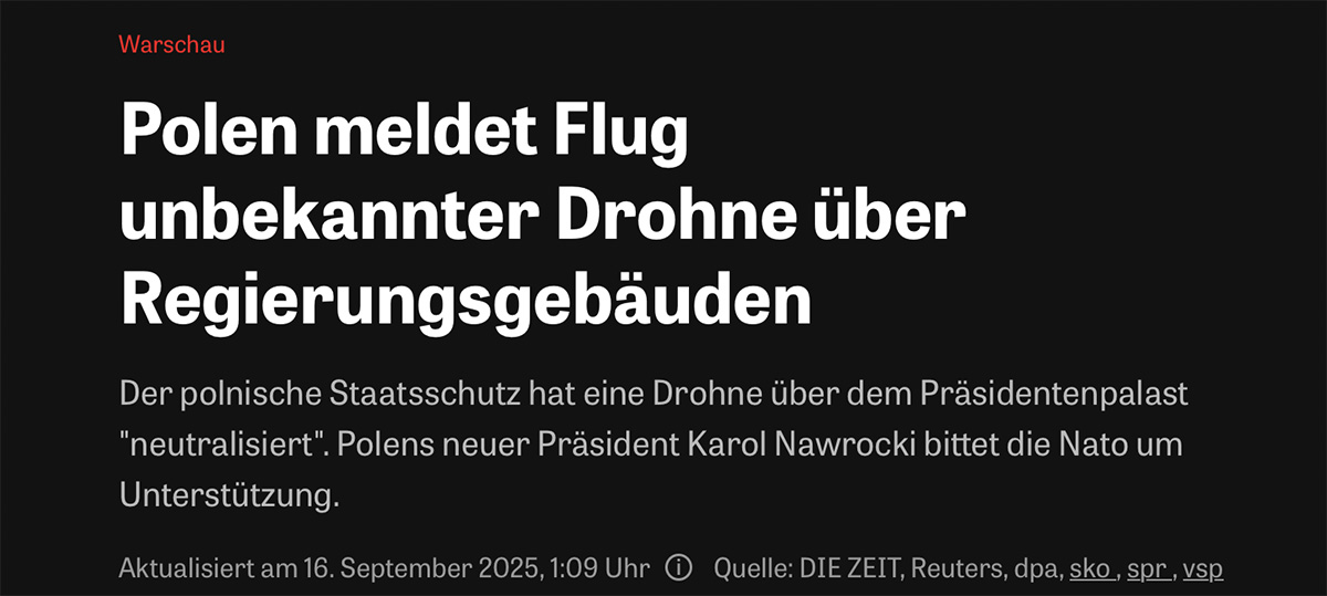 Am 19. September berichtete die ZEIT: „Der polnische Staatsschutz hat eine Drohne über dem Präsidentenpalast „neutralisiert“. Polens neuer Präsident Karol Nawrocki bittet die Nato um Unterstützung.“
