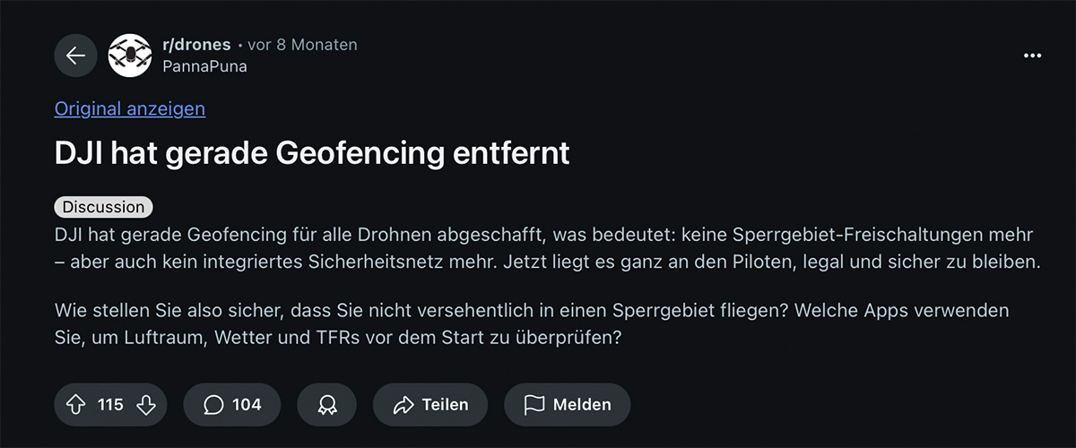 DJI (Da-Jiang Innovations Science and Technology Co., Ltd) gilt als Weltmarktführer bei Drohnen für den privaten und gewerblichen Gebrauch und weist einen Jahresumsatz von mehr als drei Milliarden Euro aus. Ein signifikanter Teil der in der EU privat erwerbbaren Drohnen stammt von dem chinesischen Unternehmen. Und tatsächlich, eine kurze Recherche reicht aus, um festzustellen, dass DJI ab Beginn 2025 das sogenannte „DJI FlySafe-System“ umgestellt hat. Statt Blockade in der Nähe von sensiblen Einrichtungen werden die privaten Nutzer nur noch gewarnt.