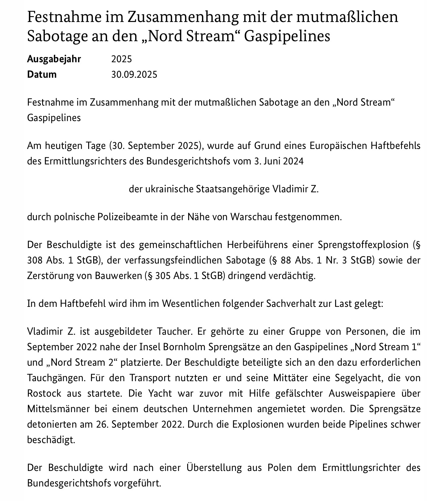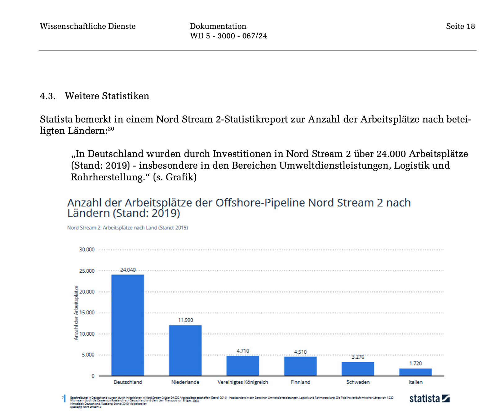 Vor diesem Hintergrund sollte man sich noch einmal vergegenwärtigen, dass der Terror-Anschlag gegen Nord Stream, und nichts anderes ist die aktive Sprengung von ziviler Infrastruktur, als der größte Sabotageakt in der Geschichte Europas gilt. Deutsche Konzerne hatten rund acht Milliarden Euro in Nordstream 1 und 2 investiert. Allein der Bau der Pipeline Nord Steam 2 sorgte laut einer Dokumentation der Wissenschaftlichen Dienste des Bundestages von 2024 für über 24.000 Arbeitsplätze in Deutschland.