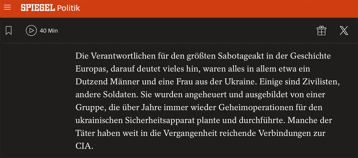 „Die Verantwortlichen für den größten Sabotageakt in der Geschichte Europas, darauf deutet vieles hin, waren alles in allem etwa ein Dutzend Männer und eine Frau aus der Ukraine. Einige sind Zivilisten, andere Soldaten. Sie wurden angeheuert und ausgebildet von einer Gruppe, die über Jahre immer wieder Geheimoperationen für den ukrainischen Sicherheitsapparat plante und durchführte. Manche der Täter haben weit in die Vergangenheit reichende Verbindungen zur CIA.“