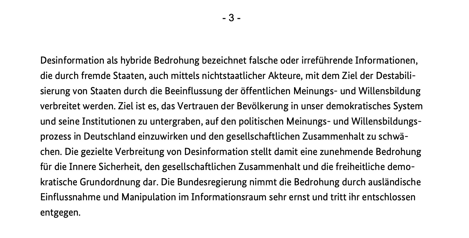 „Desinformation als hybride Bedrohung bezeichnet falsche oder irreführende Informationen, die durch fremde Staaten, auch mittels nichtstaatlicher Akteure, mit dem Ziel der Destabilisierung von Staaten durch die Beeinflussung der öffentlichen Meinungs- und Willensbildung verbreitet werden. Ziel ist es, das Vertrauen der Bevölkerung in unser demokratisches System und seine Institutionen zu untergraben, auf den politischen Meinungs- und Willensbildungsprozess in Deutschland einzuwirken und den gesellschaftlichen Zusammenhalt zu schwächen.“