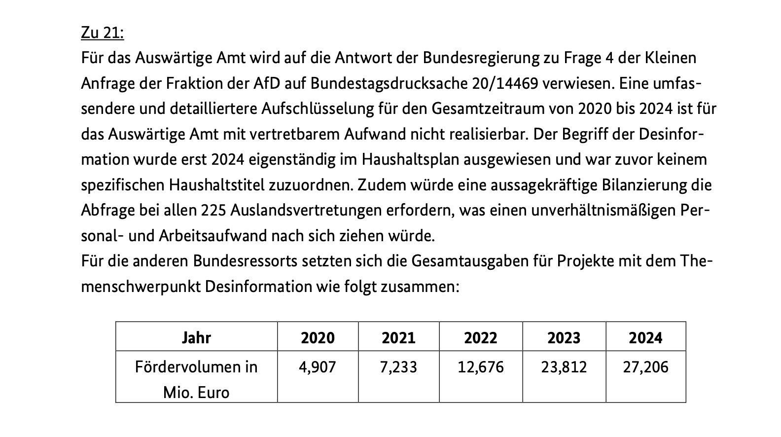 Eindrücklich ist der enorme Anstieg bei den Mittelzuwendungen der Bundesregierung im Themenfeld „Desinformation“. 2020 betrug das Fördervolumen „für Projekte mit dem Themenschwerpunkt Desinformation“ 4,9 Millionen Euro. Nur vier Jahre später finanzierte die Bundesregierung das Thema bereits mit 27,2 Millionen Euro – eine Steigerung um mehr als 450 Prozent. Der Betrag ist zudem mutmaßlich signifikant höher, weil sich das Auswärtige Amt im Gegensatz zu allen anderen Ministerien weigerte („nicht vertretbarer Aufwand“), eine Aufschlüsselung der Ausgaben zu diesem Themenfeld vorzulegen: