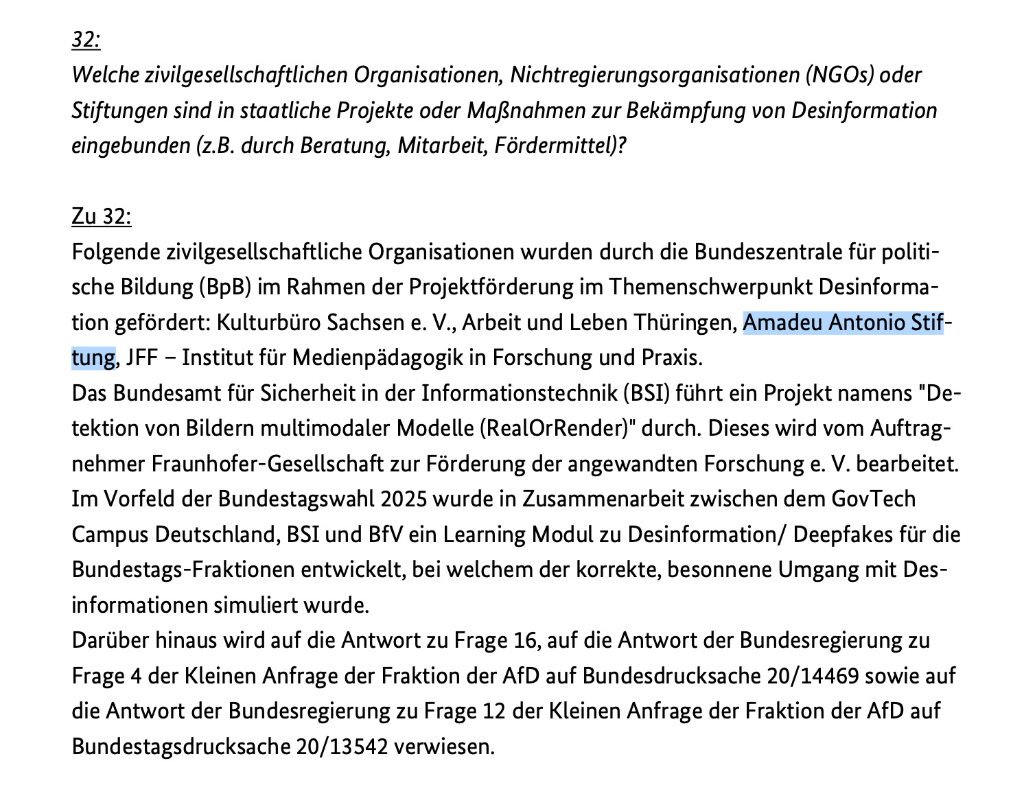 In diesem Zusammenhang ist auch die Antwort der Bundesregierung auf die Frage aufschlussreich, „welche zivilgesellschaftlichen Organisationen, Nichtregierungsorganisationen (NGOs) oder Stiftungen in staatliche Projekte oder Maßnahmen zur Bekämpfung von Desinformation“ eingebunden sind. In der Definitionslogik der Bundesregierung dürften diese sich ja nur „ausländischer Desinformation“ widmen. Die Bundesregierung nennt allerdings nur vier Organisationen, darunter zwei ausschließlich regional tätige: „Kulturbüro Sachsen“ sowie „Arbeit und Leben Thüringen“. Bundesweit tätige „zivilgesellschaftliche Organisationen zur Bekämpfung von Desinformation“ fördert die Bundesregierung nach eigener Darstellung nur zwei, darunter die wegen ihres tendenziösen und oft diffamatorischen Vorgehens hochumstrittene „Amadeu Antonio Stiftung“, gegründet von der langjährig als Stasi-Spitzel tätigen Anetta Kahane (IM-Vorgang V 55/74):