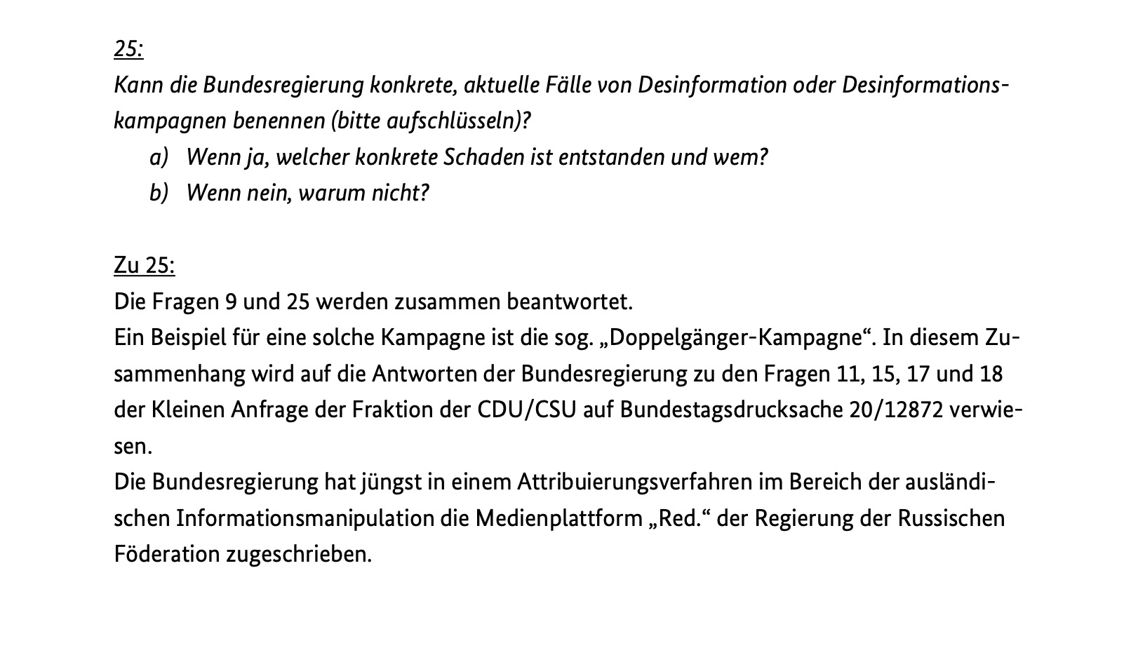 „Der Effekt solcher Desinformationskampagnen lässt sich gegenwärtig nicht belastbar messen. Nichtsdestotrotz handelt es sich bei solchen Kampagnen um konkrete Versuche (mutmaßlich) ausländischer Akteure, sowohl die Bundesregierung an sich als auch demokratische Vertreter und ihre Institutionen im In- und Ausland nachhaltig zu diskreditieren.“