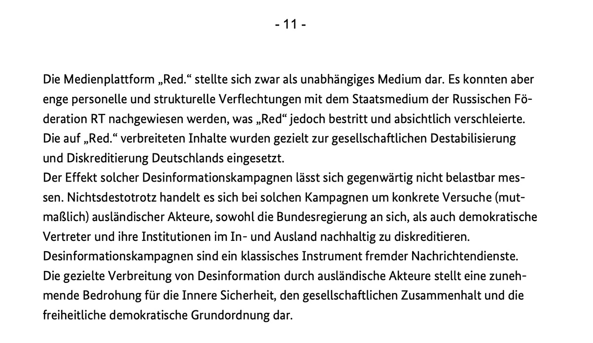 Das heißt, in den „Belegen“ der EU (mutmaßlich zusammengetragen von Mitarbeitern des Auswärtigen Amtes) findet sich weder das von der Bundesregierung behauptete „Attribuierungsverfahren“ noch irgendein anderer Beweis für die angebliche Verbindung „zur Regierung der Russischen Föderation“ oder „enge personelle und strukturelle Verflechtungen mit dem Staatsmedium der Russischen Föderation“. Auch die Behauptung, dass die auf Red verbreiteten Inhalte „gezielt zur gesellschaftlichen Destabilisierung und Diskreditierung Deutschlands“ eingesetzt würden, wird in dem „evidence pack“ nicht substantiiert.