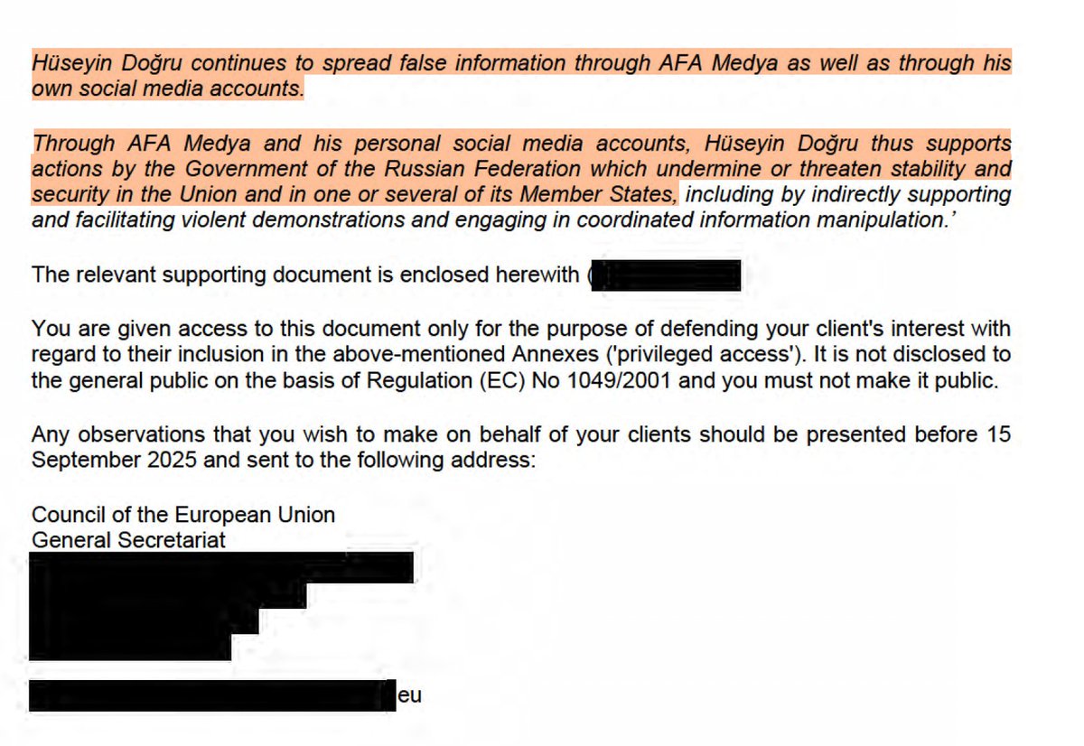 Widerlegen lässt sich die Darstellung der Bundesregierung, weil Doğru über seine Anwälte am 1. September Zugang zum kompletten „evidence pack“ der EU erhalten hat – also den gesamten Beweisunterlagen für die angebliche Desinformationskampagne von Red, auf deren alleiniger (!) Grundlage die umfassenden Sanktionen gegen ihn und seine Medien-Plattform gerechtfertigt werden.