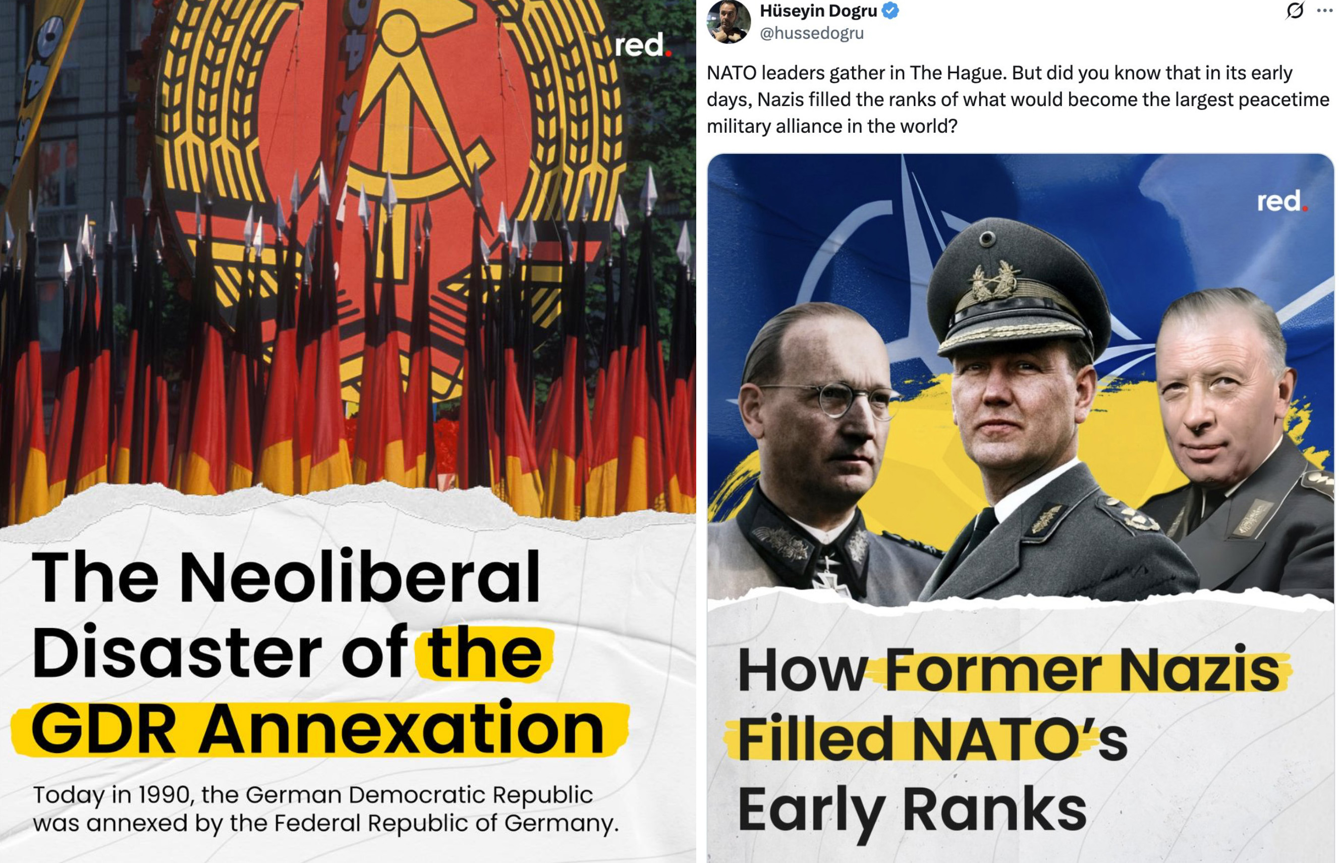 Das „Beweismaterial“ umfasst nach seiner Darlegung ausschließlich Tweets von seinem privaten X-Account sowie von Red Media. Darunter ein Tweet, in dem er sich über die Tatenlosigkeit deutscher Journalisten-Kollegen beschwert sowie zwei Tweets, in denen er sich kritisch mit dem Aufrüstungsdiskurs von Kanzler Merz auseinandersetzt. Als Beleg für die angebliche Desinformationskampagne von Red führt die EU z.B. zwei sogenannte Sharepics an. Einmal zum 3. Oktober 2024 sowie über die historisch belegte Rolle von ehemaligen Wehrmachtsoffizieren in späteren Führungspositionen der NATO:
