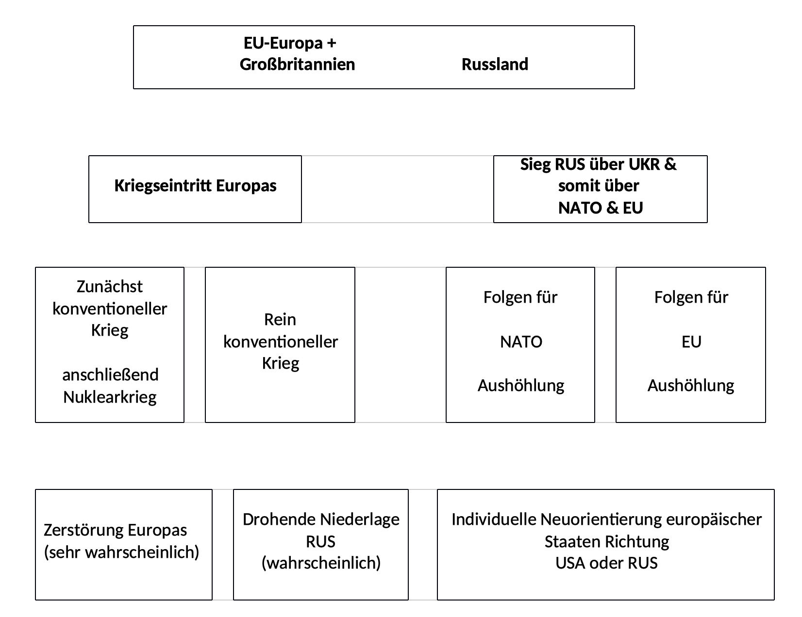 Die Voraussetzung zur Überlegung einer neuen europäischen Sicherheitsarchitektur/Friedensordnung ist, dass der Krieg nicht über den ukrainischen Raum ausgreifen darf – also weder einen intendierten Kriegseintritt der Europäer noch unbeabsichtigte Zwischenfälle mit eskalierender Eigendynamik. Nach gegenwärtiger Entwicklung auf dem Schlachtfeld würde dies mit an Sicherheit grenzender Wahrscheinlichkeit bedeuten, dass Russland das Kriegsende im Wesentlichen zu seinen Bedingungen diktieren würde. EU-Europa und die europäischen NATO-Staaten, außen- und innenpolitisch geschwächt, wären den Vorstellungen Russlands in gewissem Ausmaß ausgeliefert. Ein Diktatfrieden durch eine Niederlage der Ukraine wäre auch eine Art Diktatfrieden für Resteuropa, da EU-Europa und NATO, wie bereits oben ausgeführt, ihr Schicksal ohne Nöte mit der Ukraine angeblich alternativlos verbunden haben.
