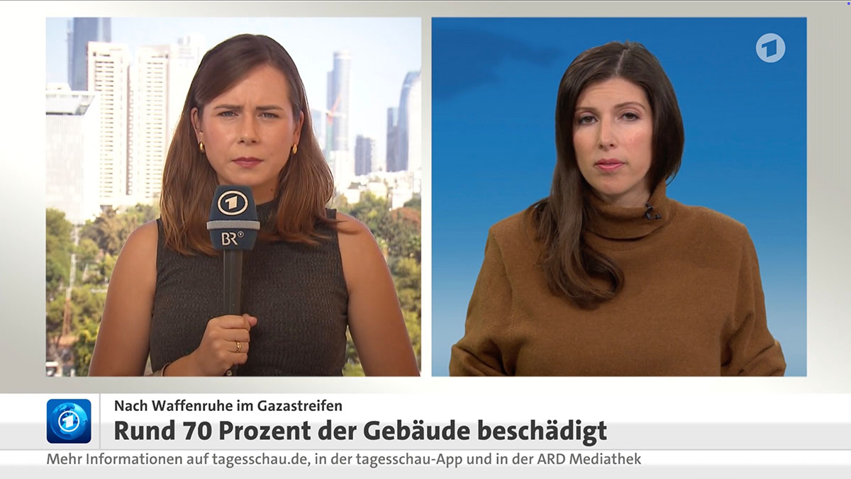 Tagesschau 24, ein Produkt der bundesdeutschen ARD, berichtet am 21. Oktober d.J. über „Details“ einer „BR-Studie“, wonach „70 Prozent des Gazastreifens zerstört“ seien. Die Tagesschau-Sprecherin kündigt den Bericht mit den Worten an: „Die Waffenruhe ist auch eine Gelegenheit, eine traurige Bilanz zu ziehen, denn durch den Krieg zwischen Israel und der Terrororganisation Hamas sind inzwischen rund 70 Prozent der Gebäude im Gazastreifen beschädigt.“ Zu diesem Ergebnis komme eine „Studie von BR-Data und dem ARD-Studio Tel Aviv, für die Satellitenbilder aus dem Zeitraum von Oktober 2023 bis September 2025 ausgewertet“ worden seien. Die Sprecherin sitzt vor einem Bild, das Zerstörungen in Gaza zeigt.