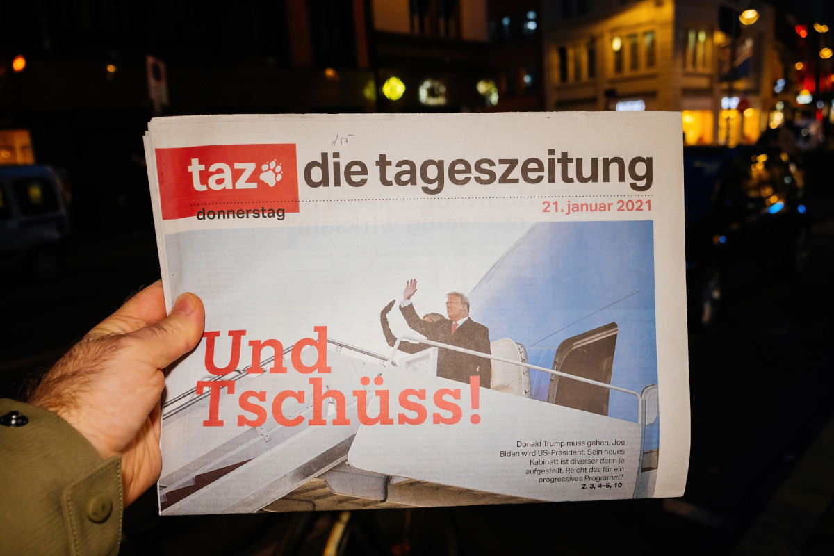 Die junge Welt (jW) äußerte den Verdacht, die Abkehr vom Gedruckten habe „möglicherweise (…) ein klein wenig damit zu tun, dass Medienhäuser verlässlich das Niveau absenken, der Konformität unterliegen und sie zugleich erzeugen und damit, dass ihre Zeitungen und sonstigen Formate folglich einander immer ähnlicher werden, weshalb, letzte Konsequenz, das Zeug nun auch keiner mehr lesen, geschweige denn kaufen will“. Anders jW, die „bleibt Printzeitung“ und titelte zur taz-Dämmerung: „Rudi, der Druck geht weiter.“