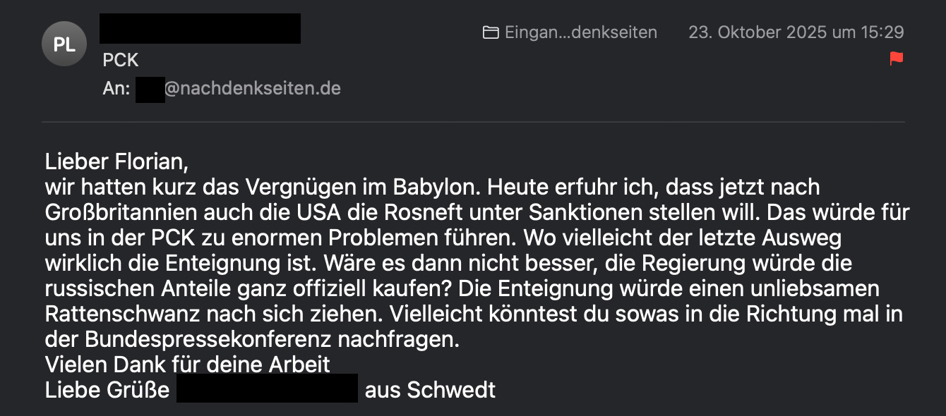 Genau diesen Anspruch „einer sachlichen, an Tatsachen orientierten und fairen Vermittlung von politischen Informationen, Aussagen und Positionen“ haben die NachDenkSeiten mit dem transparenten Verweis auf die ihnen zugegangene Fragestellung der PCK-Mitarbeiter erfüllt.