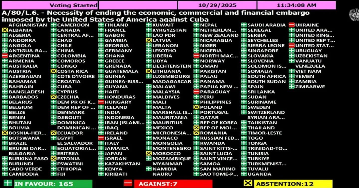 Im Rahmen der diesjährigen Sitzungsperiode der UN-Vollversammlung haben 165 Staaten für die von Kuba vorgelegte Resolution mit dem Titel „Notwendigkeit der Aufhebung des von den Vereinigten Staaten von Amerika gegen Kuba verhängten Wirtschafts-, Handels- und Finanzembargos” votiert. Zwölf Regierungen enthielten sich und sieben votierten dagegen, darunter die USA sowie Israel, die Ukraine, Argentinien, Ungarn, Paraguay und Nordmazedonien. Die US-Nachrichtenagentur Reuters titelte in ihrer Meldung: „Die USA konnten bei der UN-Abstimmung zur Beendigung des Kuba-Embargos keinen entscheidenden Einfluss ausüben.” Von Edgar Göll.