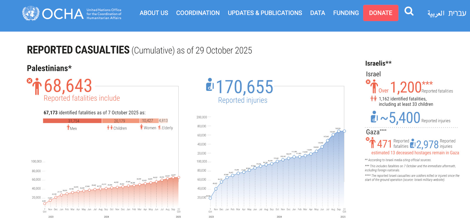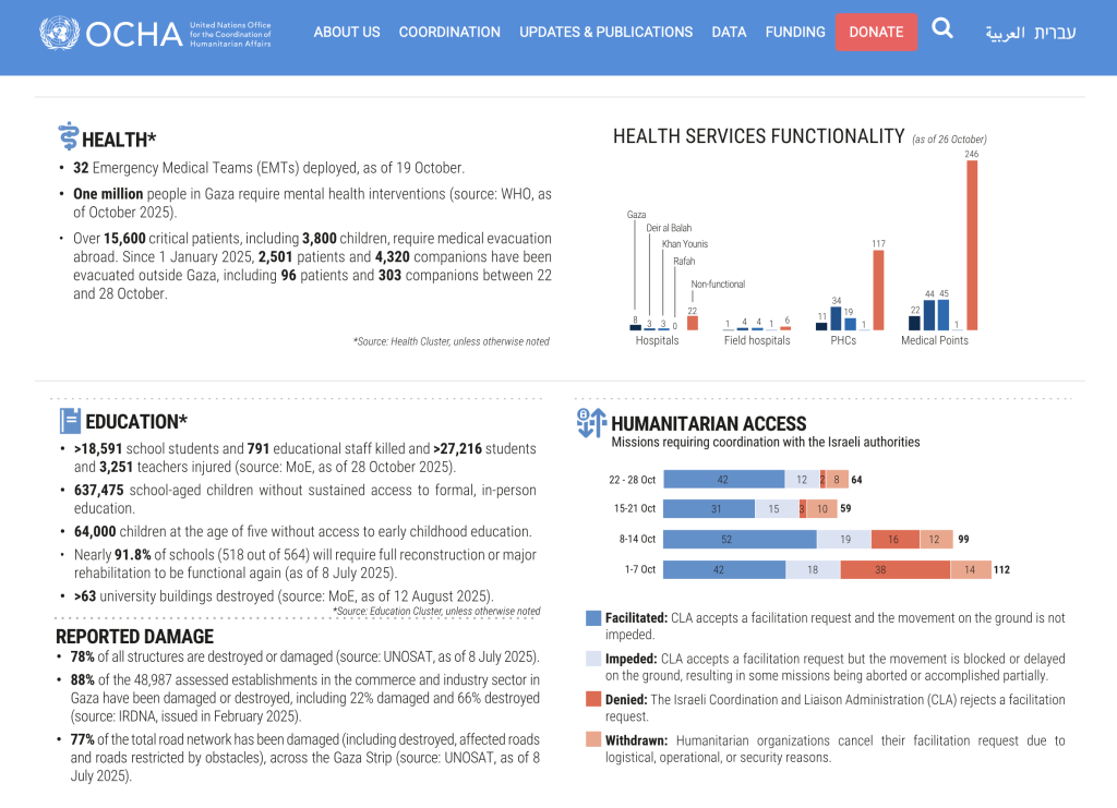 UN-Angaben mit Stand 29. Oktober zufolge sind im Gazastreifen 22 von insgesamt 36 Krankhäuser nicht mehr funktionsfähig. Im Gouvernement Rafah (rund 200.000 Einwohner) gibt es laut den Vereinten Nationen kein einziges funktionierendes Krankenhaus mehr. Um sich eine Vorstellung des gigantischen Ausmaßes an Zerstörung machen zu können, sei auf die UN-verifizierte Zahl von 518 zerstörten Schulen verwiesen, das entspricht 91,6 Prozent aller im Gastreifen vor Kriegsbeginn registrierten Schulen. Die Zahl der verletzten Zivilisten beträgt nach aktuellem Stand 170.655 – darunter im Vergleich zu anderen Kriegsgebieten überproportional viele Kinder: