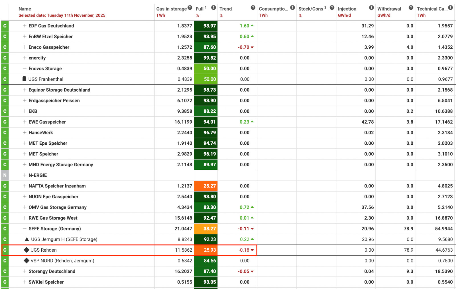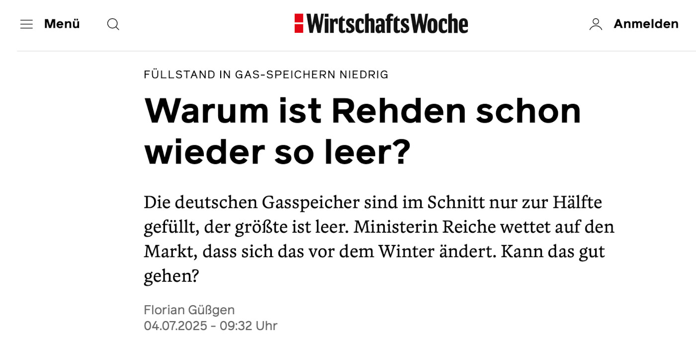 Bereits Anfang Juli 2025 titelte die Wirtschaftswoche: „FÜLLSTAND IN GAS-SPEICHERN NIEDRIG – Warum ist Rehden schon wieder so leer?“
