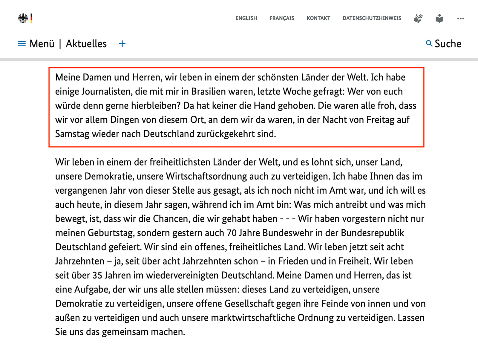 „Meine Damen und Herren, wir leben in einem der schönsten Länder der Welt. Ich habe einige Journalisten, die mit mir in Brasilien waren, letzte Woche gefragt: Wer von euch würde denn gerne hierbleiben? Da hat keiner die Hand gehoben. Die waren alle froh, dass wir vor allem Dingen (sic!) von diesem Ort, an dem wir da waren, in der Nacht von Freitag auf Samstag wieder nach Deutschland zurückgekehrt sind.“