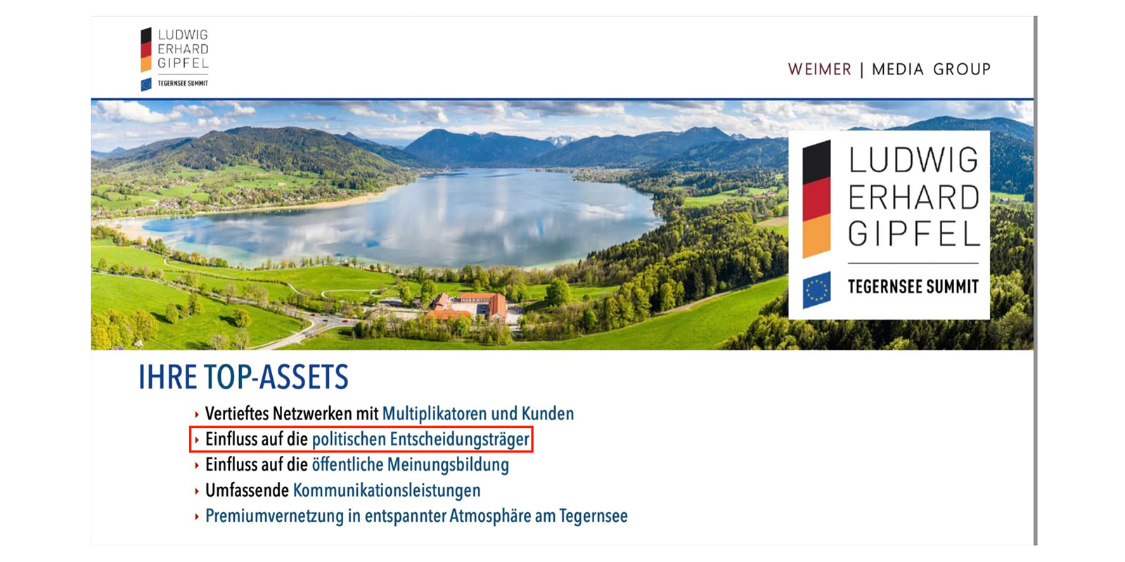 Dabei geht es um recht dubiose Einnahmequellen. In Verkaufsunterlagen, die dem Magazin vorliegen, würden interessierten Unternehmen „exklusive Zugänge“ zu Spitzenpolitikern offeriert, als sogenannte Top-Assets „Premiumvernetzung in entspannter Atmosphäre am Tegernsee“ und „Einfluss auf die politischen Entscheidungsträger“ beworben. Dabei ließen sich unterschiedliche Pakete buchen. Das namens „Zugspitze“ koste 40.000 Euro plus Mehrwertsteuer, enthalte „zehn Eintrittskarten zur Konferenz für Geschäftspartner, Kunden und Unternehmensmanager“, Werbeleistungen in den WMG-Wirtschaftsmedien sowie eine „Rednerpräsenz auf der Konferenz (Panelteilnahme)“. Beim Paket „Matterhorn“ zu 60.000 Euro netto und „Mont Blanc“ zu 80.000 Euro netto komme die „Teilnahme eines Vorstands/Geschäftsführers an der exklusiven Executive Night“ hinzu.
