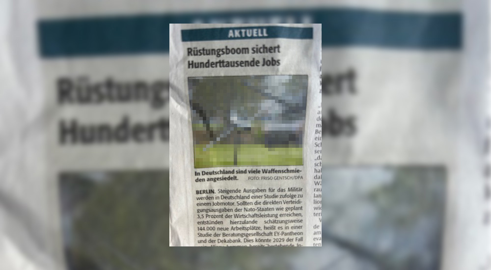 Prominent auf der ersten Seite erschien heute in der Tageszeitung Die Rheinpfalz der oben abgebildete Artikel. „Steigende Ausgaben für das Militär … werden zu einem Jobmotor“, wird behauptet. Und es wird dabei unterschlagen, dass andere wichtige öffentliche Güter und Einrichtungen wie Schulen, Schienenwege, Straßen, Kindergärten usw. genauso mit diesem Geld produziert werden könnten. Und dies oft – anders als bei militärischen Gütern – ohne Vorleistungen aus anderen Ländern wie den USA oder Frankreich geschehen könnte. Die Überschrift könnte dann heißen: „Der Boom an Ausgaben für Schulen, Schienenwege und andere öffentliche Leistungen sichert Hunderttausende Jobs“. Albrecht Müller.