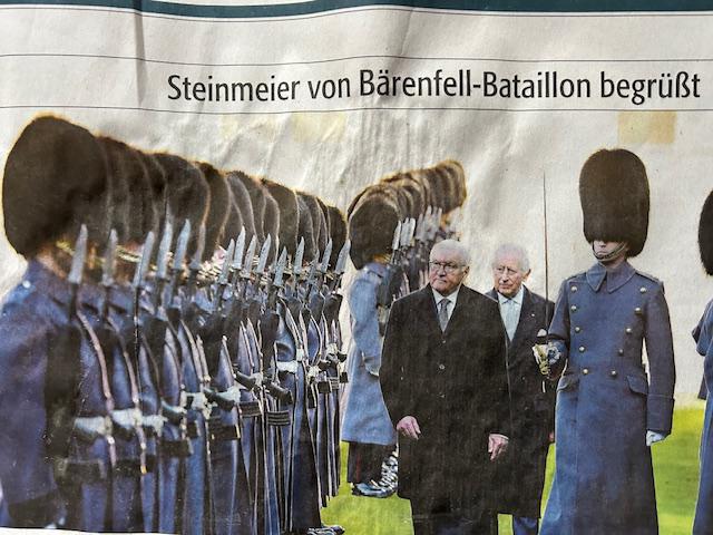 Bundespräsident Steinmeier ist zum Staatsbesuch in Großbritannien. Meine Tageszeitung zeigt ihn auf einem Foto von afp bei der Begrüßung durch ein Bataillon. Die Köpfe der angetretenen Soldaten sind mit Bärenfell-Mützen bedeckt; außerdem mit gefährlich ausschauenden Gewehren mit scharfen aufgepflanzten Bajonetten ausgestattet. Einen solch undemokratischen Stuss macht unser Staatsoberhaupt mit. Das kommt der Verherrlichung von Gewalt und antidemokratischer Zeiten gleich. Deshalb sollte Steinmeier so etwas nicht über sich ergehen lassen. Wenn das nicht möglich ist, dann sollte er auf den Staatsbesuch verzichten. Lieber keiner als ein solcher. Albrecht Müller.