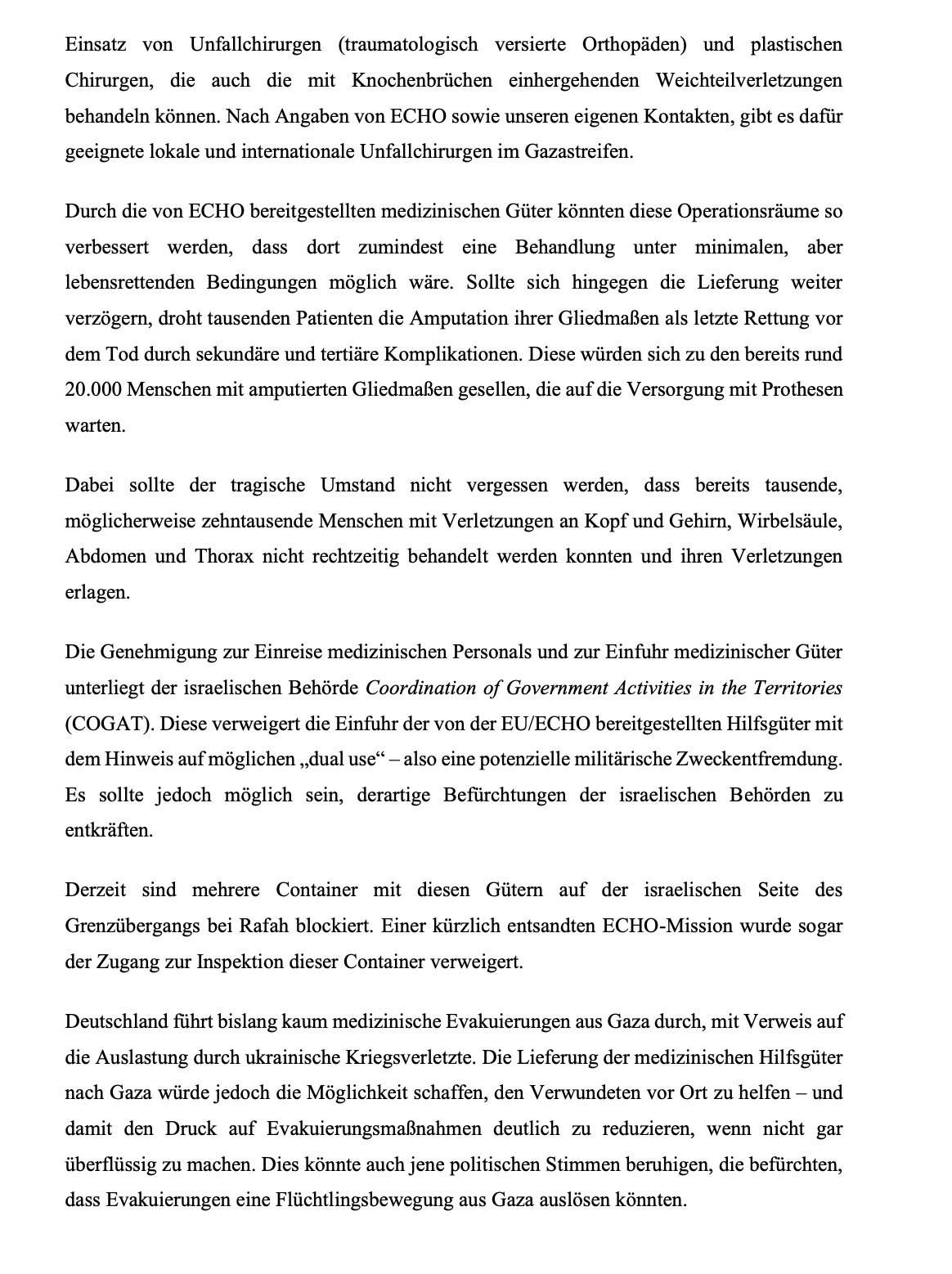 „Die Ermöglichung der Lieferung von medizinischen Gütern nach Gaza und die Behandlung der Verwundeten vor Ort ist ein Gebot der Humanität. Damit würde der Druck auf kostspielige Evakuierungsmaßnahmen deutlich verringert oder diese sogar überflüssig gemacht, und jene politischen Stimmen beruhigt, die befürchten, dass Evakuierungen eine Flüchtlingsbewegung aus Gaza auslösen könnten.“
