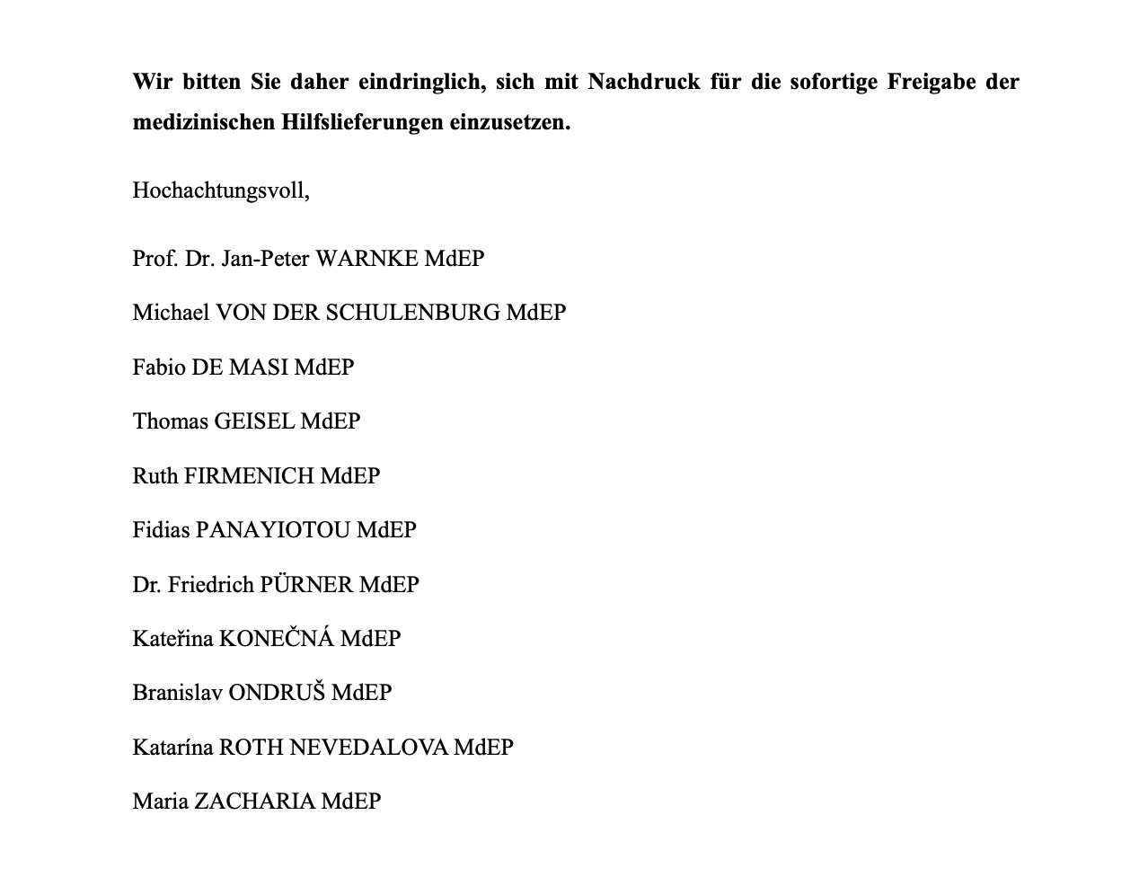 In dem Offenen Brief weisen die EU-Abgeordneten zudem darauf hin, „dass bereits tausende, möglicherweise zehntausende Menschen mit Verletzungen an Kopf und Gehirn, Wirbelsäule, Abdomen und Thorax nicht rechtzeitig behandelt werden konnten und ihren Verletzungen erlagen“.