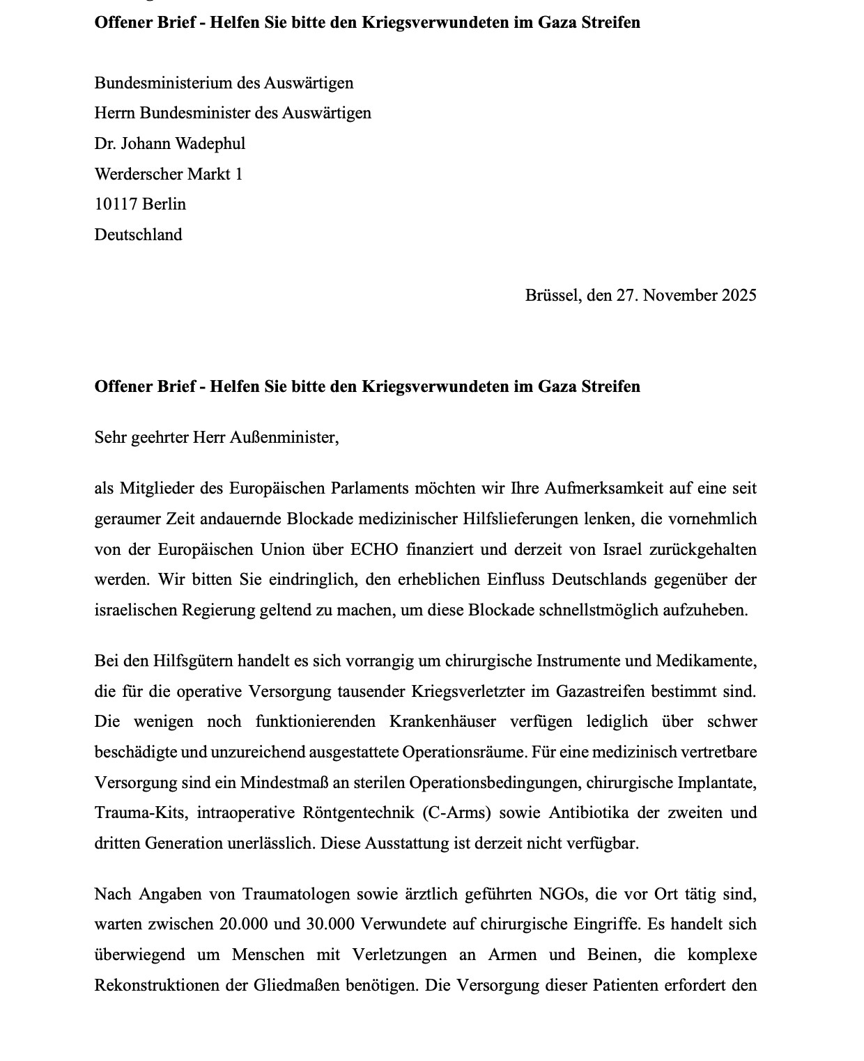 Auf Initiative von Prof. Dr. Jan-Peter Warnke, fraktionsloses Mitglied des Europäischen Parlamentes für das BSW und bis zu seiner Pensionierung 2023 ein weltweit renommierter Neurochirurg, hatte am 28. November eine Gruppe von Europaabgeordneten verschiedener Parteien und Länder einen Offenen Brief an den deutschen Außenminister Johann Wadephul verschickt. Darin wird Wadephul aufgefordert, den Einfluss Deutschlands gegenüber der israelischen Regierung zu nutzen, um die seit langem bestehende Blockade von medizinischen Hilfsgütern für den Gazastreifen aufzuheben.