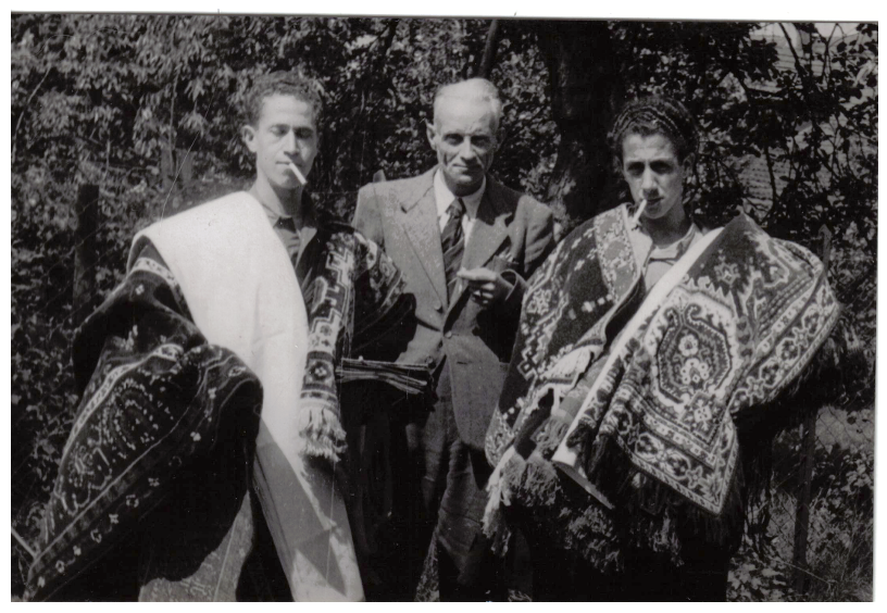 Einmal zogen zwei „Mockscher” – Nordafrikaner – mit je einem schweren Teppich auf der Schulter durch den Ort von Stahlarbeitern, Bergleuten, Bergmannsbauern, Kleinbauern, Handwerkern und wollten ihnen Berberteppiche verkaufen. Ob es glückte, weiß ich nicht, aber es gibt ein Foto von den beiden, wie sie rauchend und lachend, einen Deutschen zwischen sich, in Opas Garten stehen. Dieser Dritte – das ist alles, was ich von ihm weiß – hatte Obdach bei Opa und Oma gefunden, er hieß Lorenz und war in einem KZ eingesperrt gewesen.