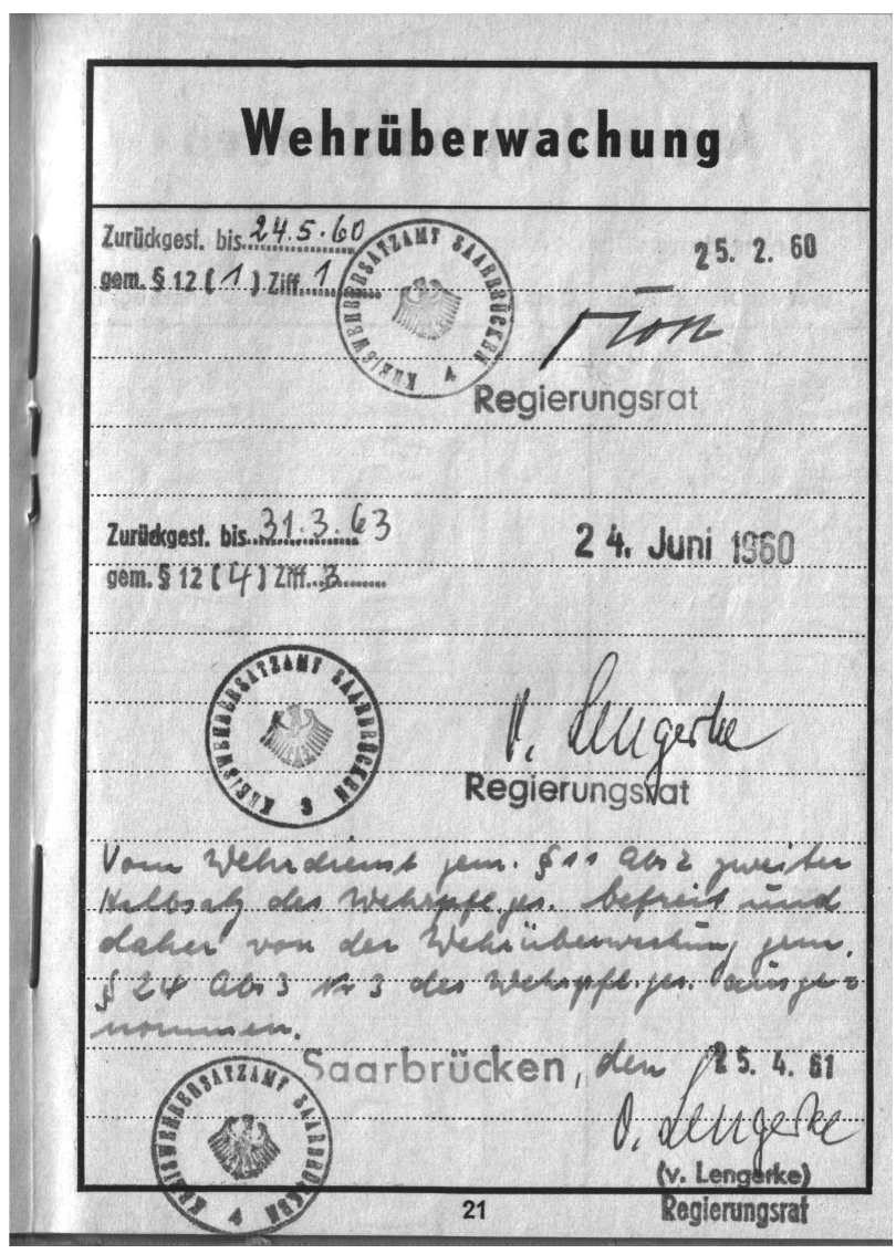 In diese Zeit fiel die Wiederbewaffnung der BRD. „Können die nie genug kriegen!”, kommentierte meine Mutter. Als der erste junge Mann aus unserem Ort in Uniform herumlief, meinte mein Stiefvater nur: „Angeber”; er wusste sicherlich, wovon er sprach. In der Schulklasse diskutierten wir, ob sie uns einziehen werden. Die Musterungen kamen im Saarland erst später; mein Jahrgang 1939 war der erste, er wurde 1960 gemustert. Da studierte ich schon und konnte darauf rechnen, vor Studienende nicht eingezogen zu werden. Kurz danach gab’s ein Gesetz, wonach die einzigen Söhne gefallener Väter auf Antrag von der Wehrpflicht befreit werden. Ich stellte den Antrag und erhielt einen entsprechenden Eintrag in meinen Wehrpass – von wegen „strammer Soldat”.
