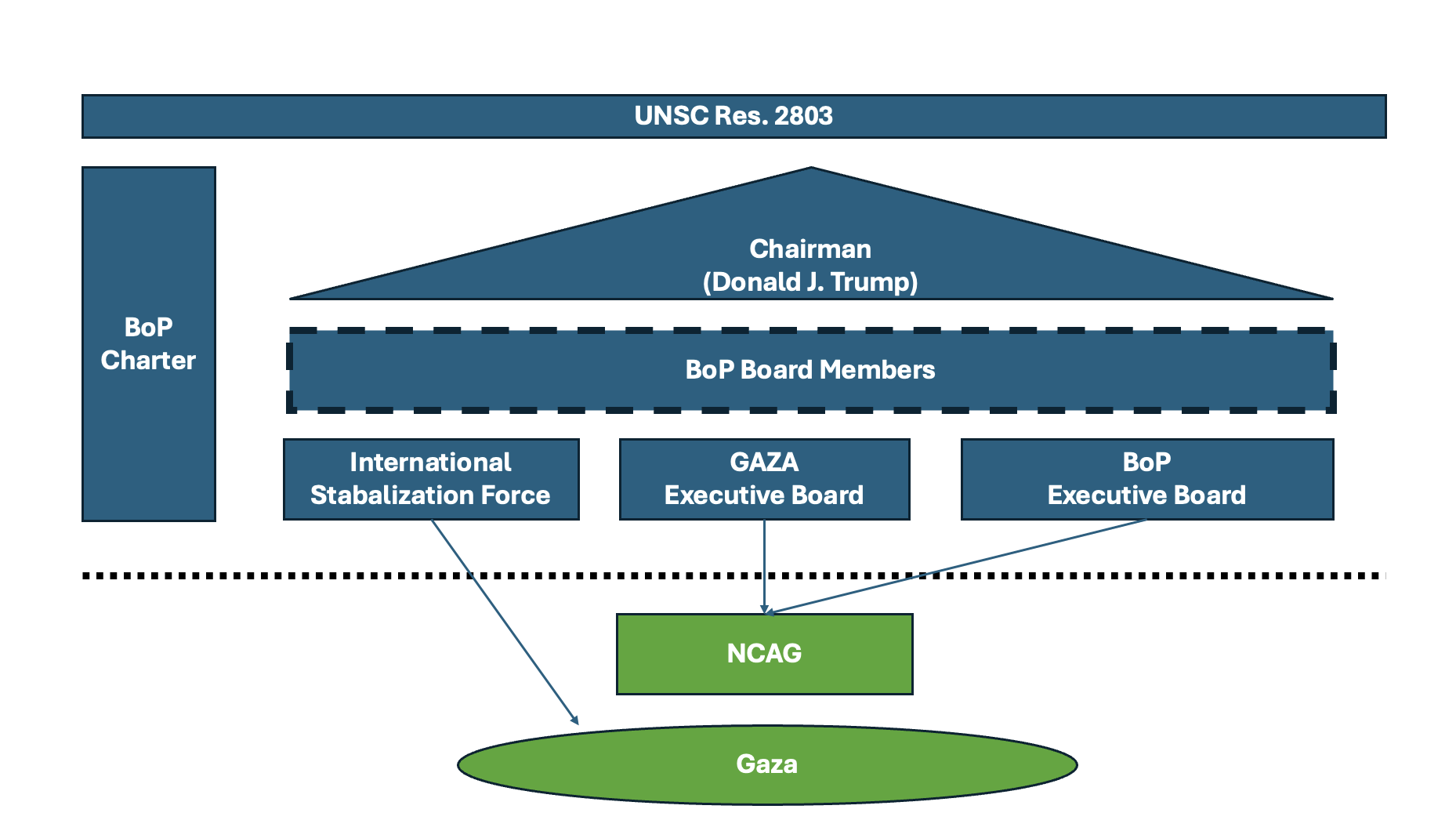 Unter dem Friedensrat wird scheinbar nun noch ein allgemeines Exekutivgremium eingesetzt. Dies scheint ein paralleles Organ zu dem bereits erwähnten Exekutivgremium speziell für Gaza zu sein. Pascal Lottaz hat einmal versucht, die Struktur der Organisation, so wie er sie aus der Satzung und anderen Informationen verstanden hat, aufzuzeichnen: