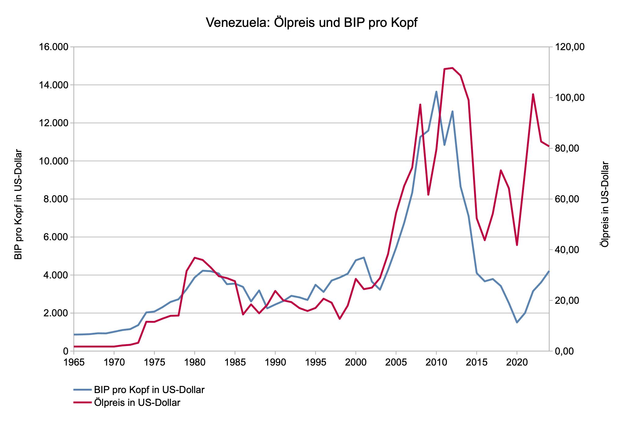Dass der sinkende Ölpreis ab Mitte 2015 nicht für den extremen Rückgang der Ausfuhren und damit die Wirtschaftskrise in Venezuela ab 2017 verantwortlich ist, zeigt ein Ländervergleich hinsichtlich des Zusammenhangs zwischen dem Ölpreis und dem Bruttoinlandsprodukt (BIP) pro Kopf.