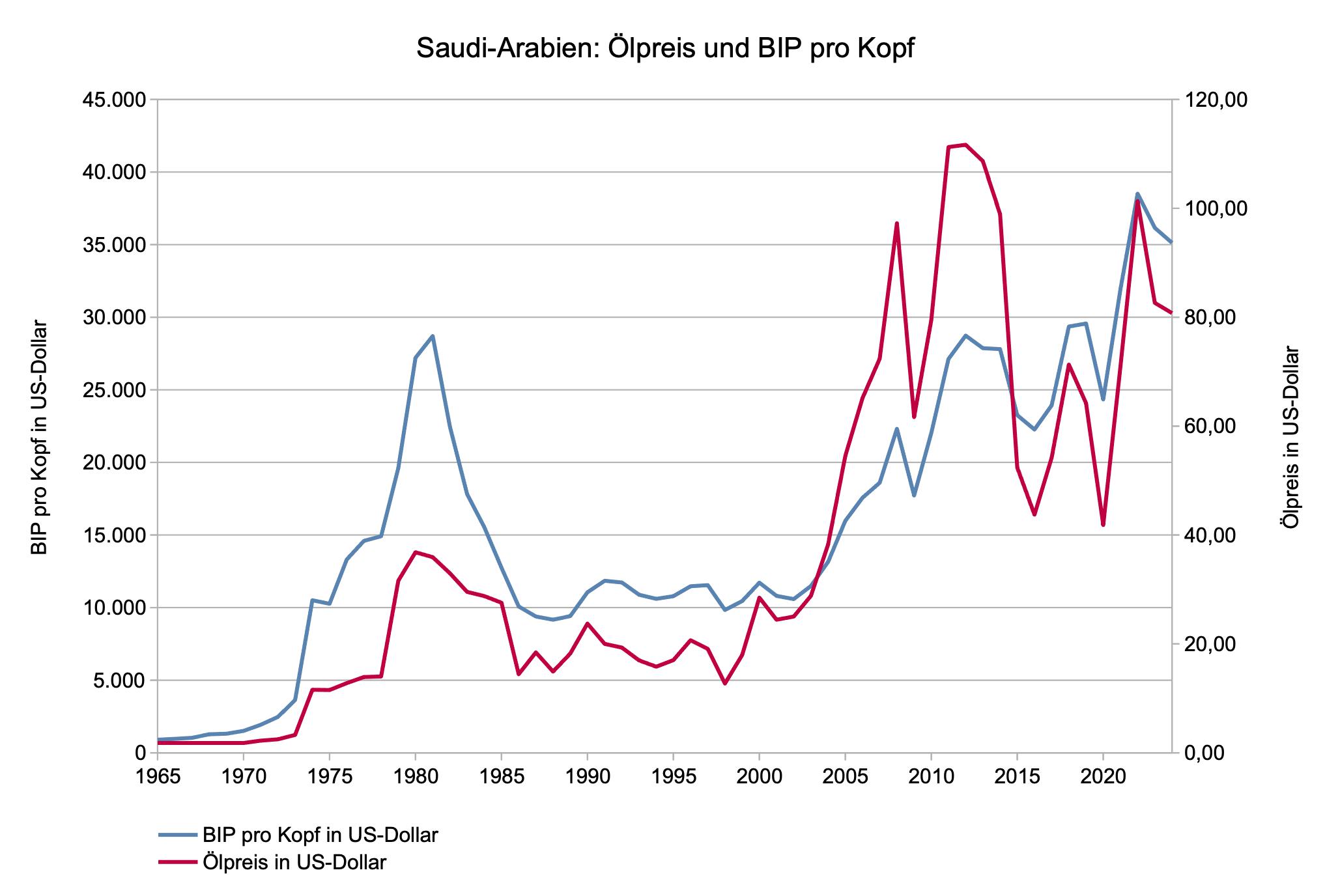 Abbildung 3: Saudi-Arabien: Ölpreis und BIP pro Kopf, Datenquelle: Statistical Review of World Energy