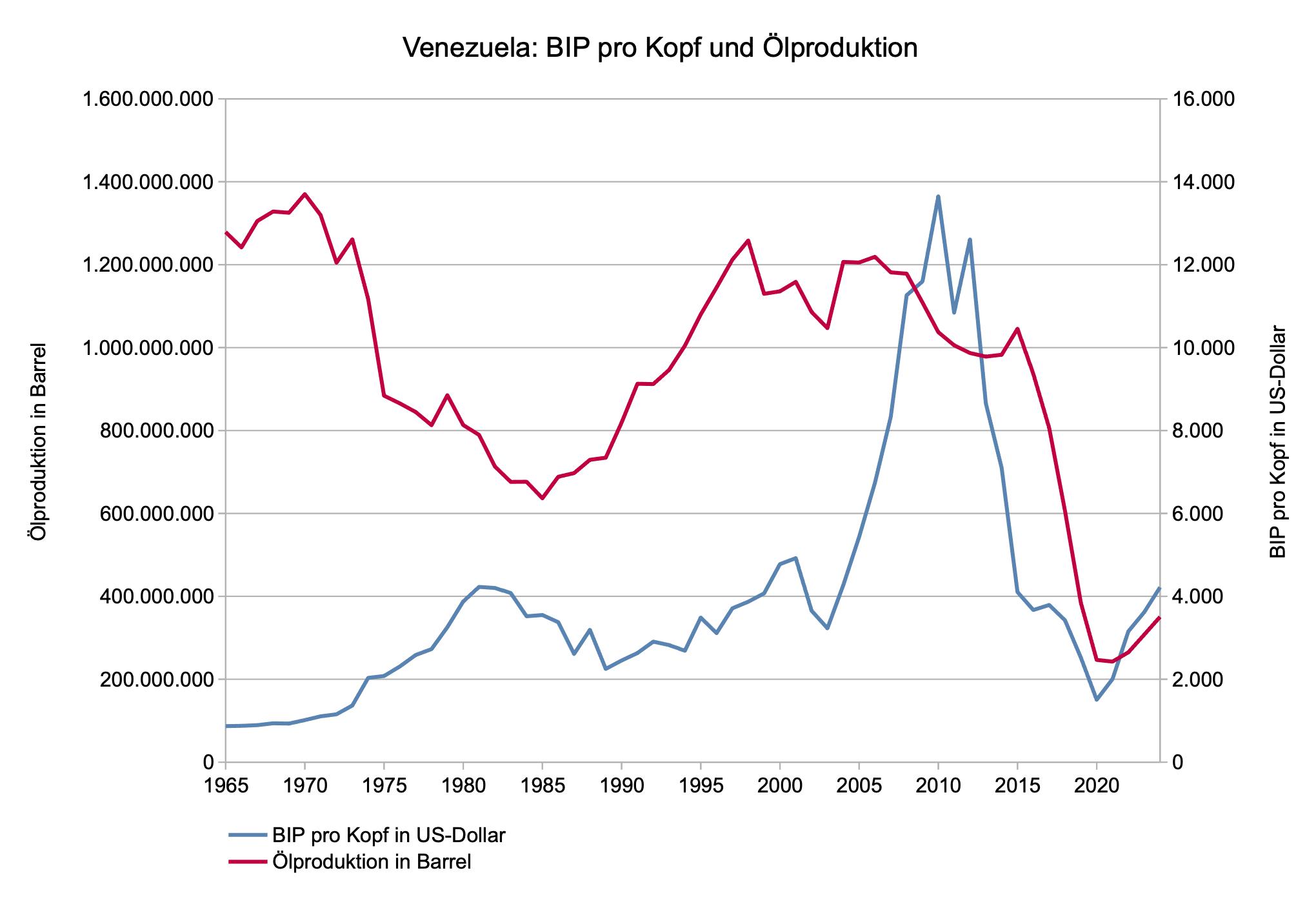 Die deutliche Parallelität des Verlaufs der Werte in Venezuela bricht 2017 abrupt ab. Erst ab 2023 ist wieder ein leichter Aufwärtstrend beim BIP pro Kopf erkennbar, der sogar entgegen der Entwicklung des Ölpreises verläuft. Im Gegensatz dazu zeigen die entsprechenden Werte in Saudi-Arabien, dessen Ölindustrie keinen Sanktionen unterworfen ist, auch nach 2017 eine parallele Entwicklung auf.