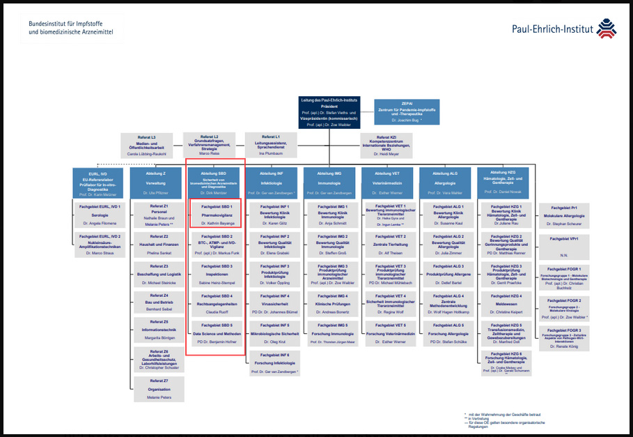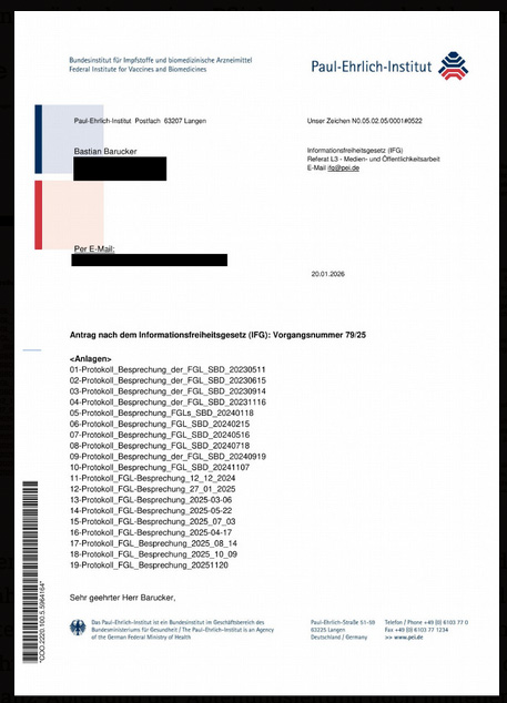 Diese Sachlage war der Ausgangspunkt meiner Bestrebungen, ähnliche Protokolle aus dem Paul-Ehrlich-Institut (PEI) zu erhalten. Daher forderte ich mittels des Informationsfreiheitsgesetzes zuerst die Protokolle des Fachgebiets „Pharmakovigilanz” (SBD 1) aus den Jahren 2019 bis 2025 an, das explizit für die Überwachung der Arzneimittelsicherheit zuständig ist. Es gehört zur Abteilung „Sicherheit von biomedizinischen Arzneimitteln und Diagnostika” (SBD).