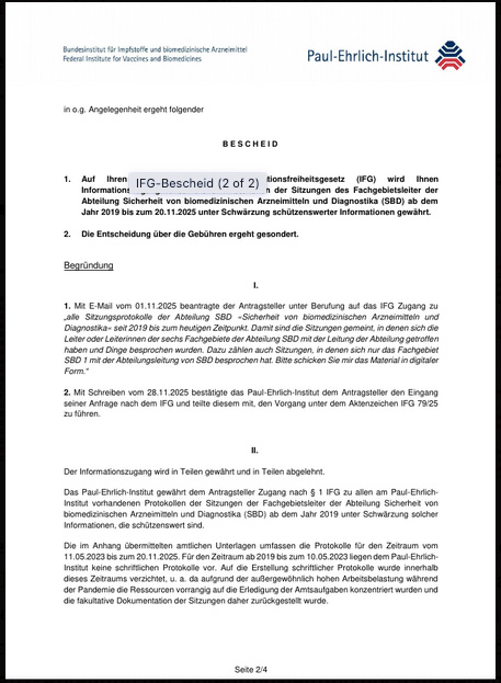 „Die im Anhang übermittelten amtlichen Unterlagen umfassen die Protokolle für den Zeitraum vom 11.05.2023 bis zum 20.11.2025. Für den Zeitraum ab 2019 bis zum 10.05.2023 liegen dem Paul-Ehrlich Institut keine schriftlichen Protokolle vor. Auf die Erstellung schriftlicher Protokolle wurde innerhalb dieses Zeitraums verzichtet, u. a. da aufgrund der außergewöhnlich hohen Arbeitsbelastung während der Pandemie die Ressourcen vorrangig auf die Erledigung der Amtsaufgaben konzentriert wurden und die fakultative Dokumentation der Sitzungen daher zurückgestellt wurde.”