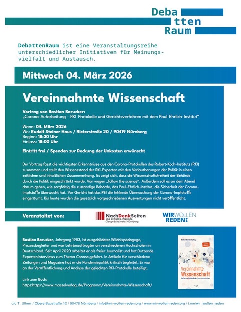 Der Autor und Wissenschaftsjournalist Bastian Barucker (Hrsg. des Buches „Vereinnahmte Wissenschaft“) wird in einem einstündigen Vortrag zentrale Erkenntnisse aus den lange unter Verschluss gehaltenen Protokollen des COVID-19-Krisenstabs am Robert Koch-Institut vorstellen. Im Anschluss ist eine offene Diskussion geplant.