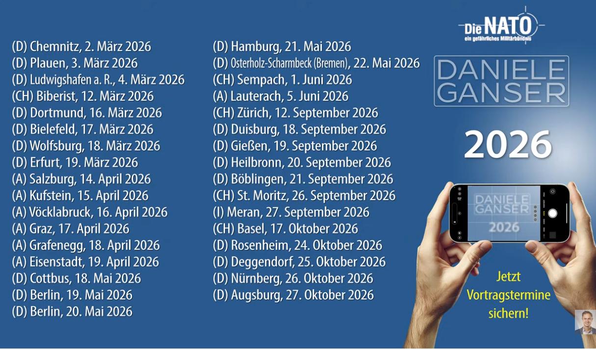 Falls Sie an einer Veranstaltung mit und von Daniele Ganser teilnehmen wollen, es folgt gleich in Anhang 1 eine Übersicht über seine Termine im Jahr 2026.