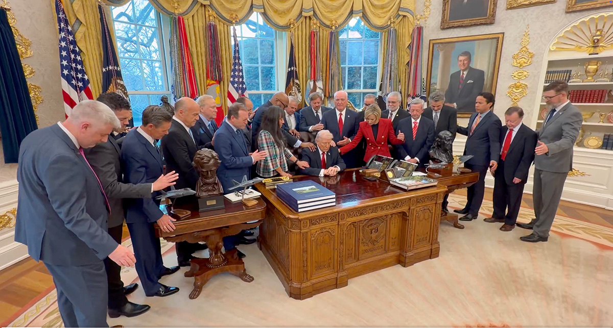 Und auch im Oval Office im Weißen Haus versammelten sich kürzlich Evangelikale um US-Präsident Donald Trump und beteten für den Krieg und legten die Hand auf ihn. Bilder des befremdlichen Rituals, das von der TV-Predigerin Paula White (laut Medien Trumps „spirituelle Beraterin“) durchgeführt wurde, finden sich unter diesem Link. Mitgebetet haben laut Medien Führungsfiguren aus der nationalchristlichen Szene, darunter Ralph Reed, Gründer und Vorsitzender der Faith and Freedom Coalition. Er sagte: