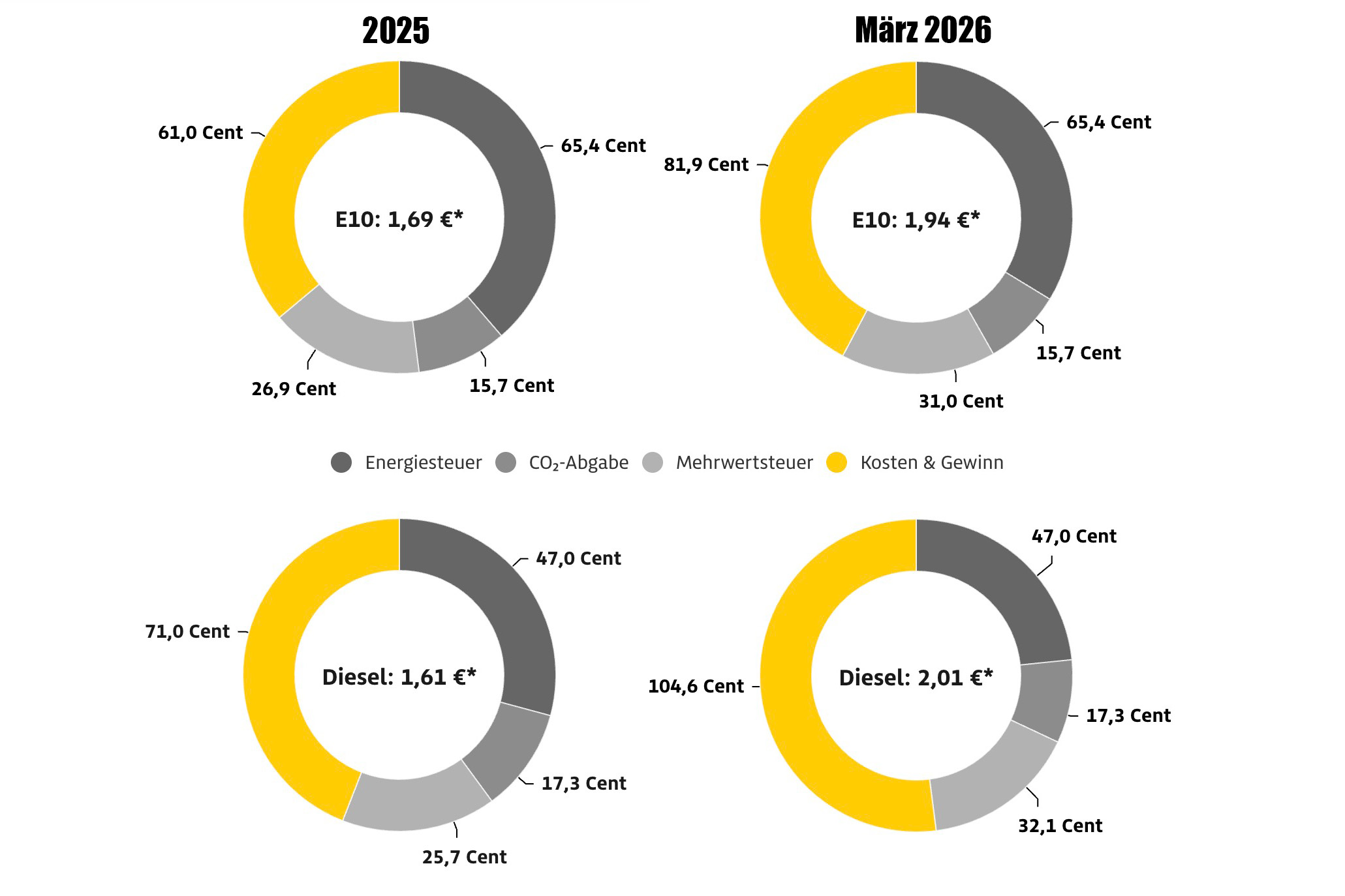 Hinzu kommt: Die mögliche Anpassung der CO₂-Abgabe greift überhaupt erst im Juli dieses Jahres. Selbst dann würde sie sich lediglich in einem Korridor von 0 bis 3,7 Cent pro Liter Benzin beziehungsweise etwa 4,1 Cent bei Diesel bewegen. Man kann diese Erhöhung kritisieren – aber für die aktuellen Preise an der Zapfsäule spielt sie schlicht keine Rolle.